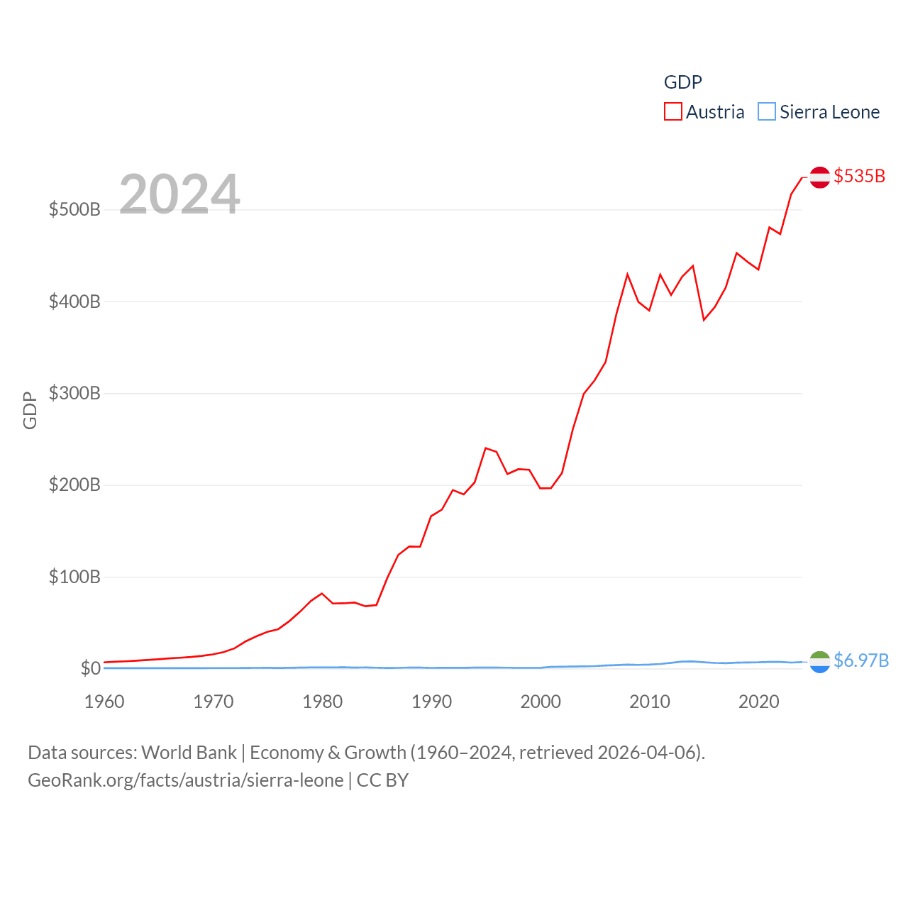 By GDP, Austria ranks 30/197 ($535B) and Sierra Leone ranks 160/197 ($6.97B). By GDP per capita, Austria ranks 16/197 ($58,269), while Sierra Leone ranks 186/197 ($807).