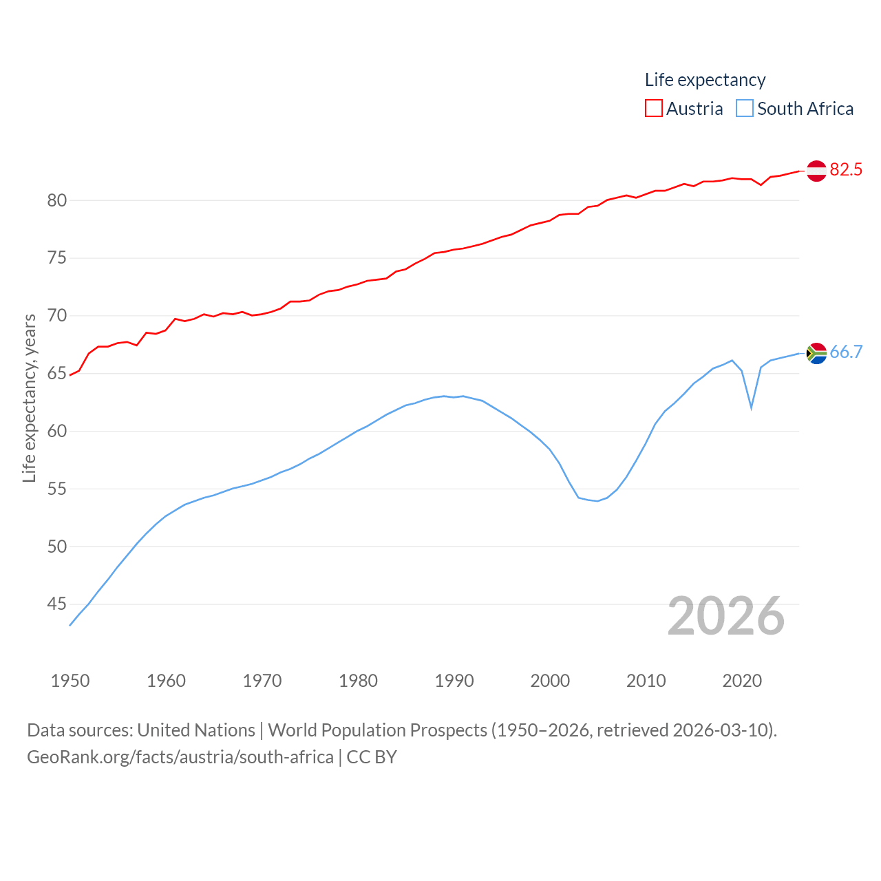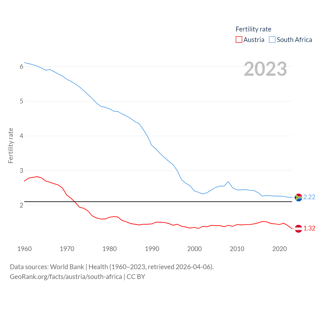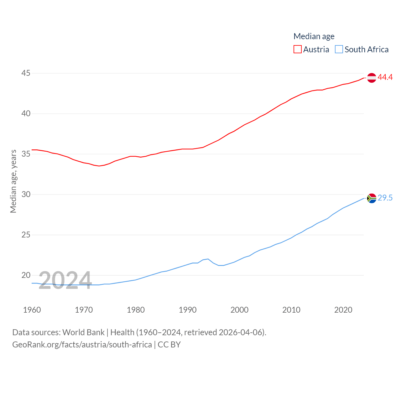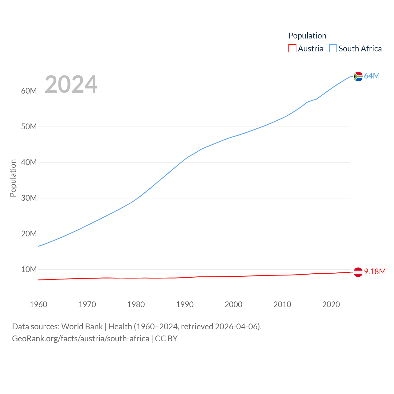 Austria has a population of 9.18M (ranked 99/197), compared with 64M in South Africa (ranked 24/197). Austria's land area is 31,861 sq mi versus 468,377 sq mi for South Africa (ranked 113th vs. 24th).