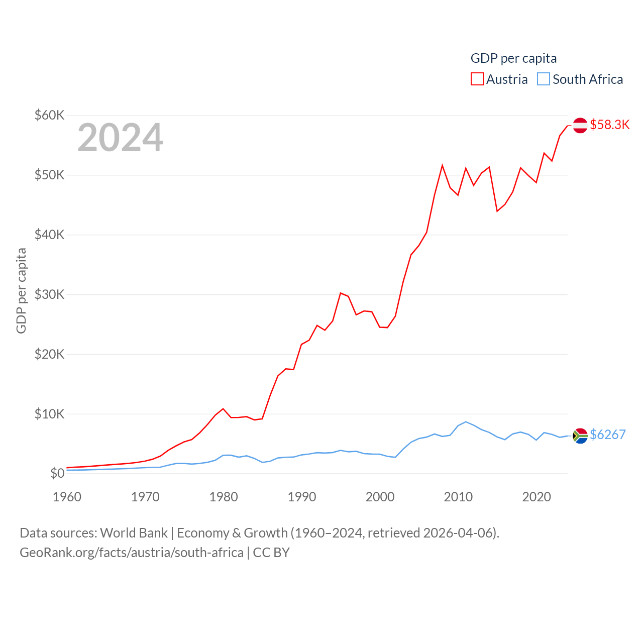 By GDP, Austria ranks 30/197 ($535B) and South Africa ranks 40/197 ($401B). By GDP per capita, Austria ranks 16/197 ($58,269), while South Africa ranks 111/197 ($6,267).