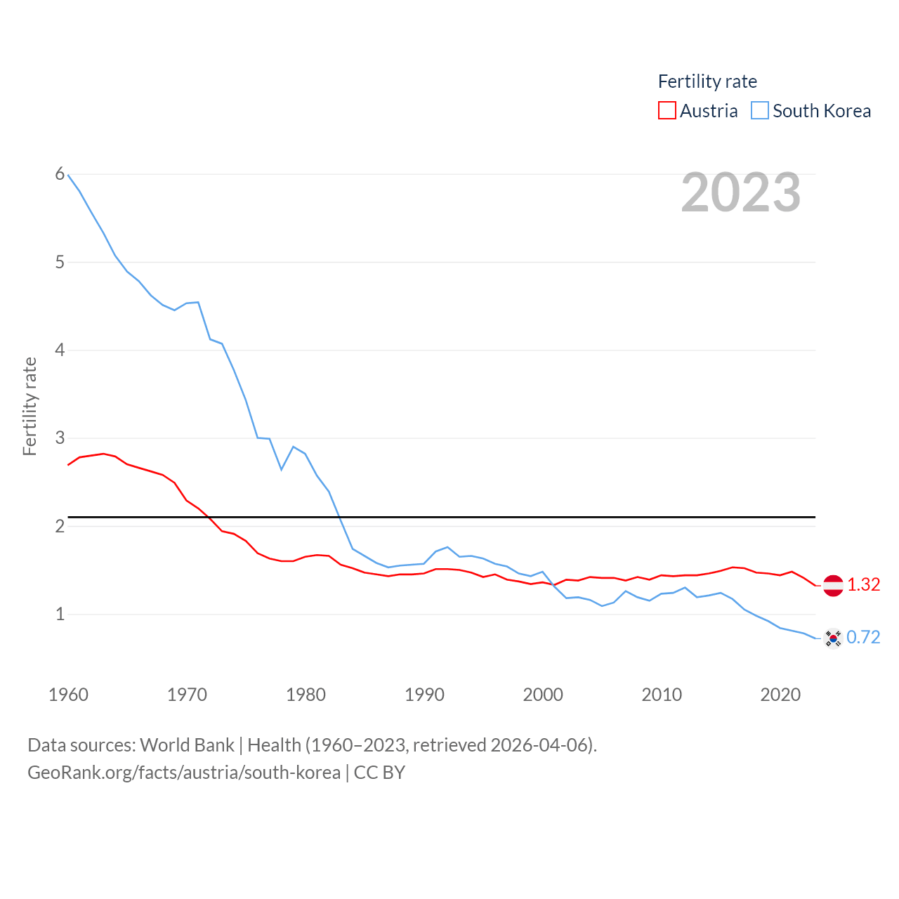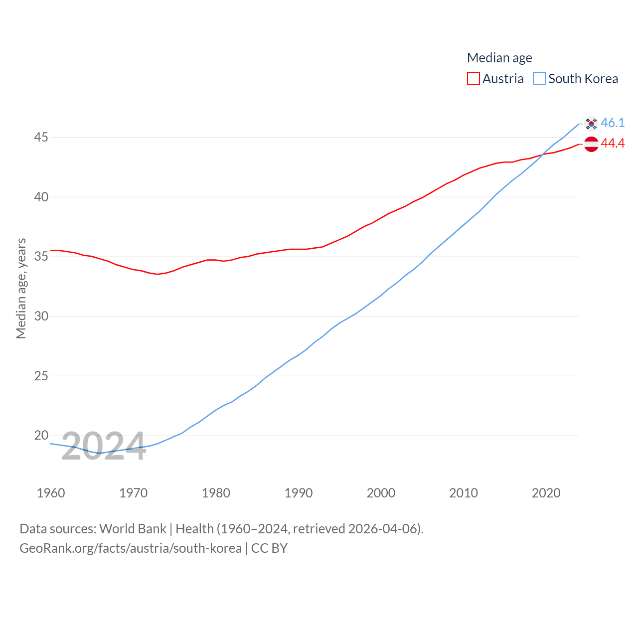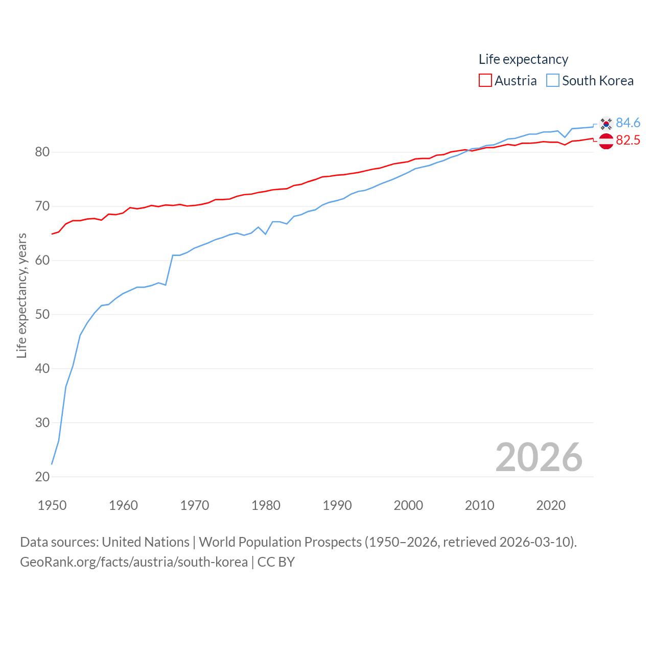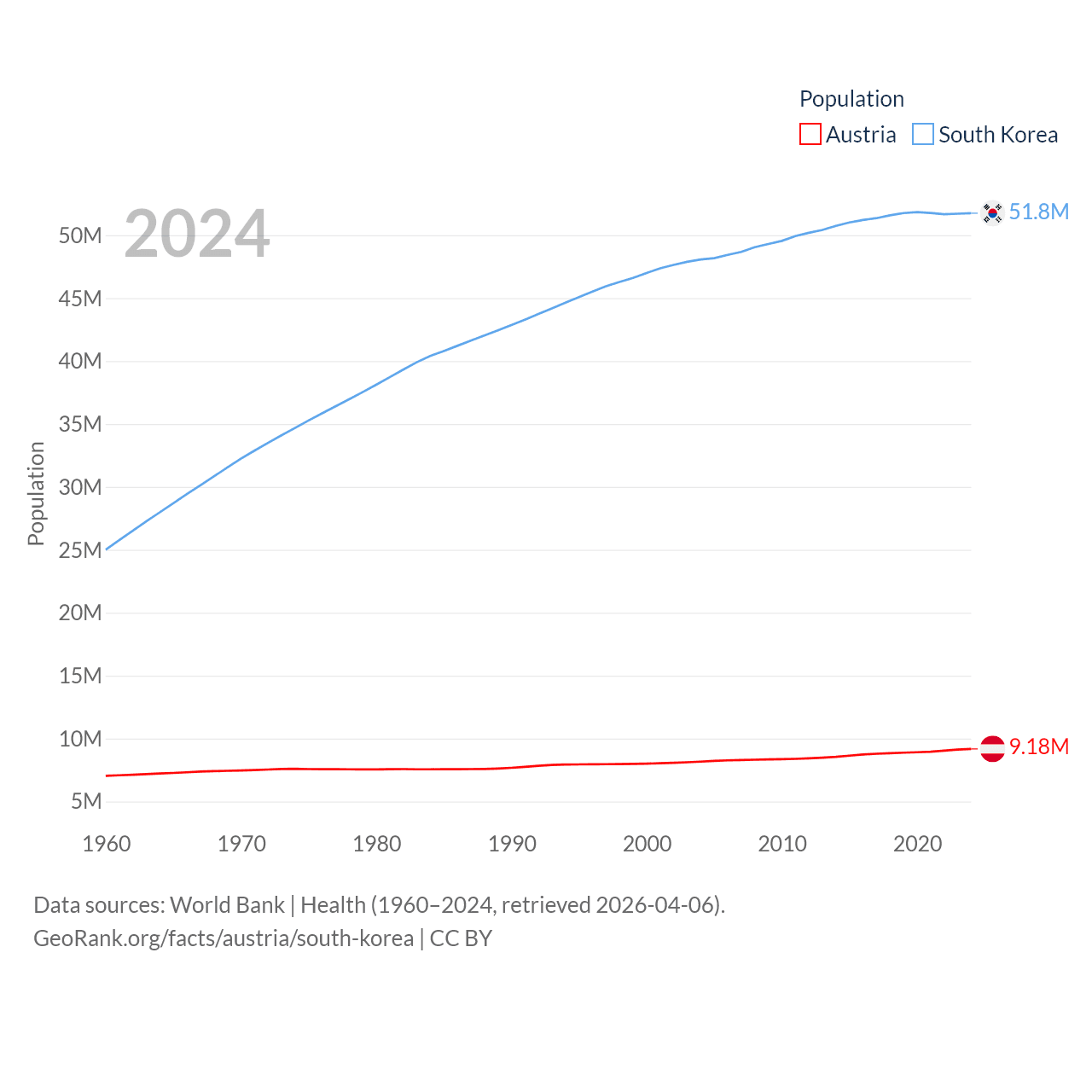 Austria has a population of 9.18M (ranked 99/197), compared with 51.8M in South Korea (ranked 29/197). Austria's land area is 31,861 sq mi versus 37,684 sq mi for South Korea (ranked 113th vs. 105th).