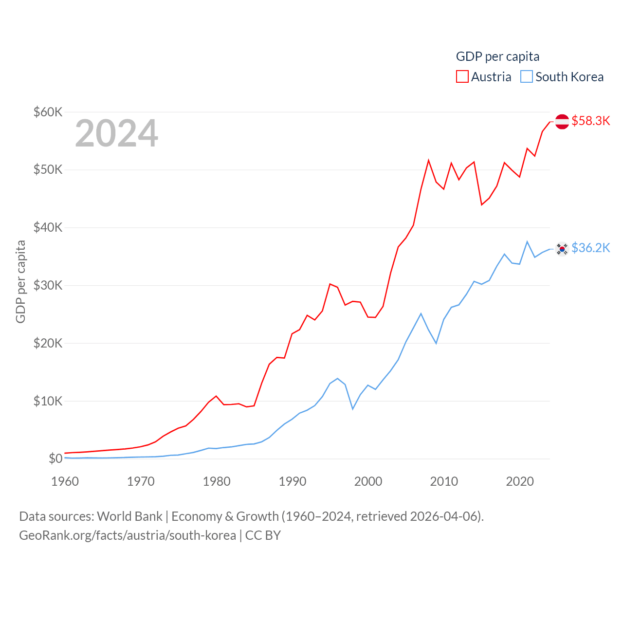 By GDP, Austria ranks 30/197 ($535B) and South Korea ranks 12/197 ($1.88T). By GDP per capita, Austria ranks 16/197 ($58,269), while South Korea ranks 31/197 ($36,239).