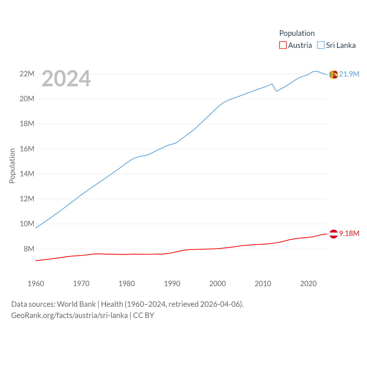 Austria has a population of 9.18M (ranked 99/197), compared with 21.9M in Sri Lanka (ranked 61/197). Austria's land area is 31,861 sq mi versus 23,884 sq mi for Sri Lanka (ranked 113th vs. 122nd).