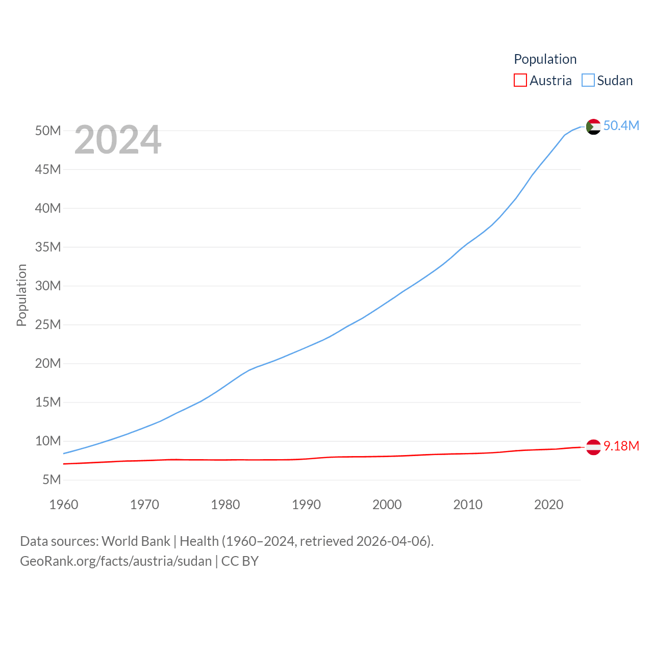 Austria has a population of 9.18M (ranked 99/197), compared with 50.4M in Sudan (ranked 30/197). Austria's land area is 31,861 sq mi versus 721,239 sq mi for Sudan (ranked 113th vs. 15th).