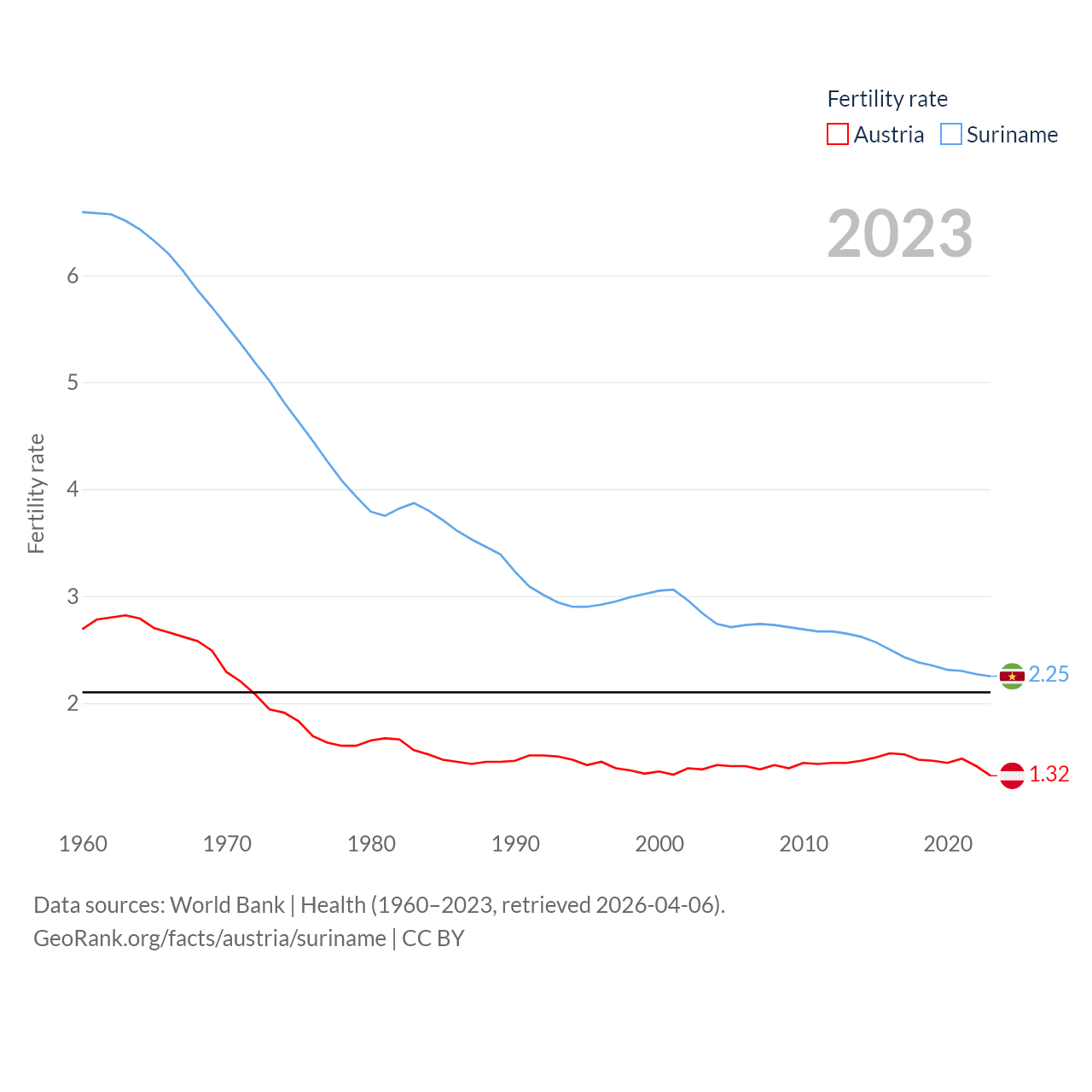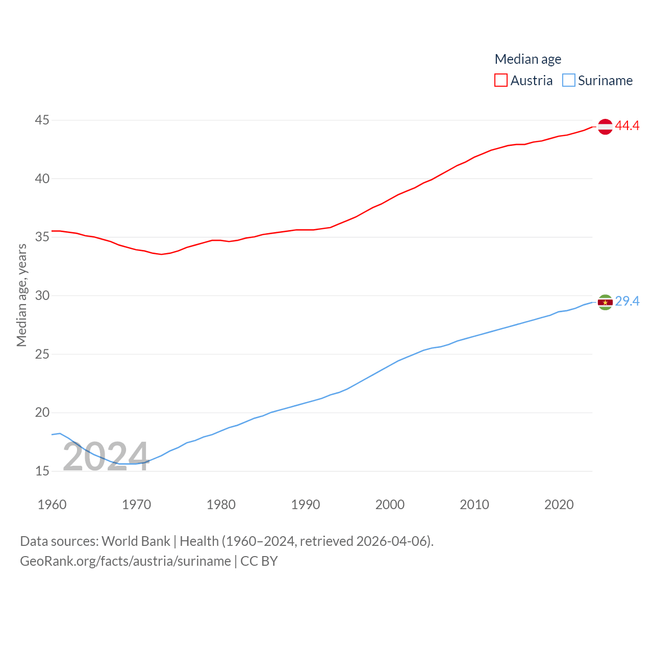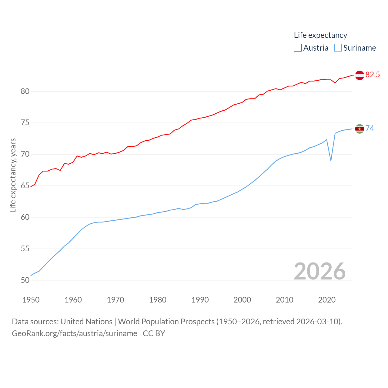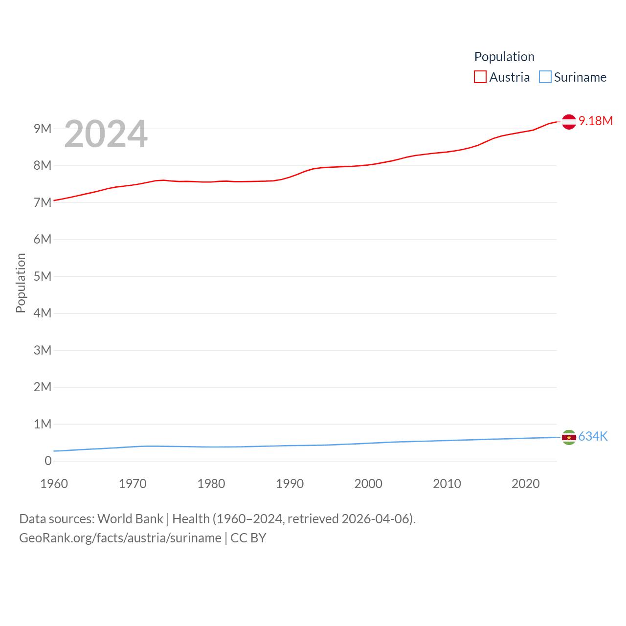 Austria has a population of 9.18M (ranked 99/197), compared with 634K in Suriname (ranked 165/197). Austria's land area is 31,861 sq mi versus 61,972 sq mi for Suriname (ranked 113th vs. 90th).