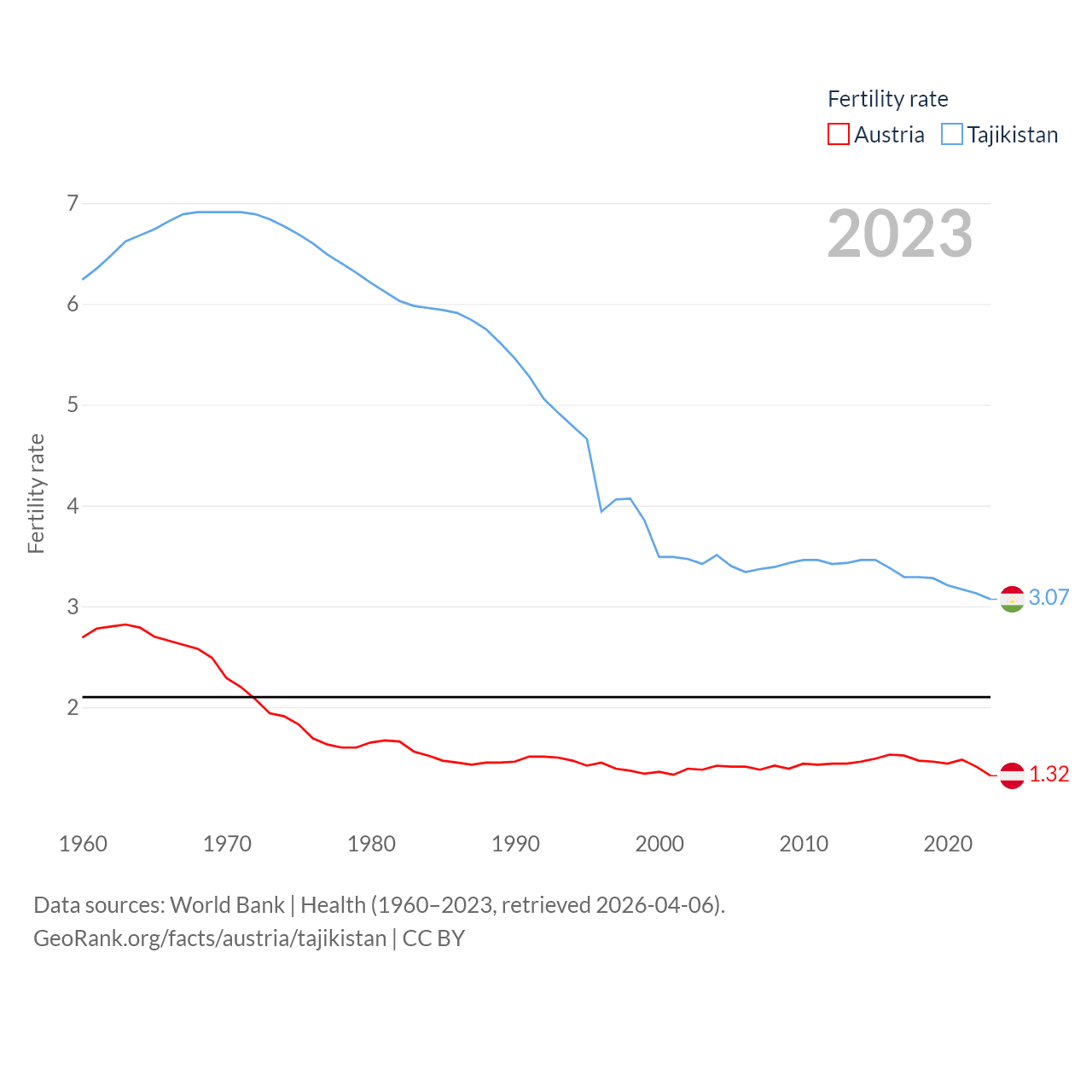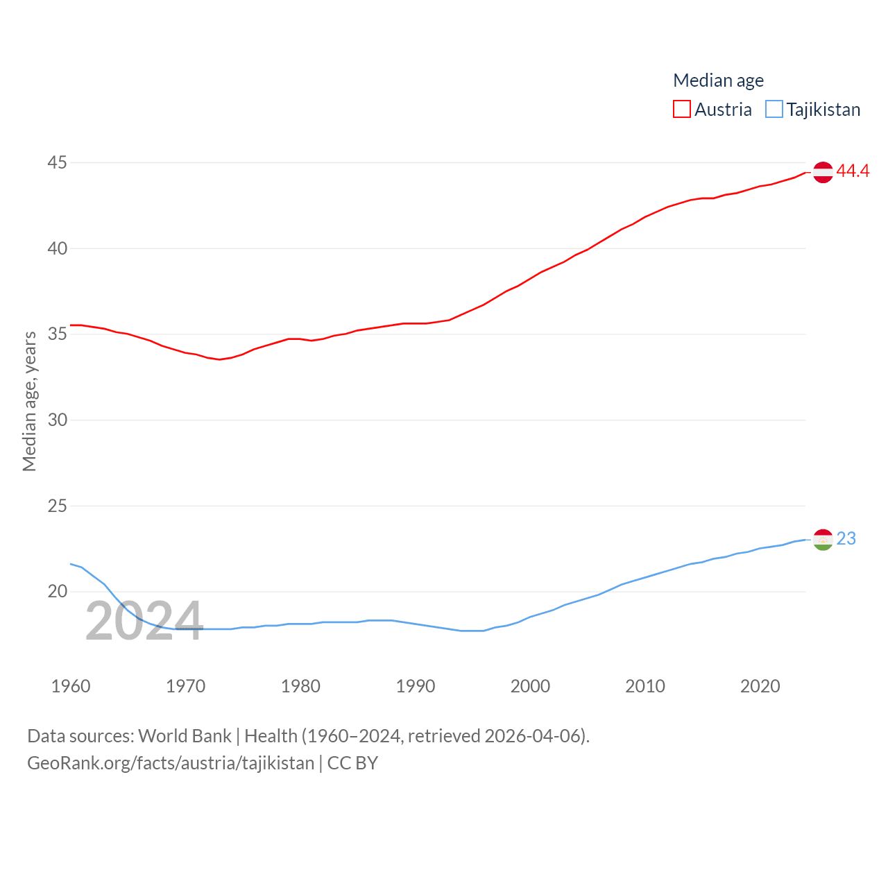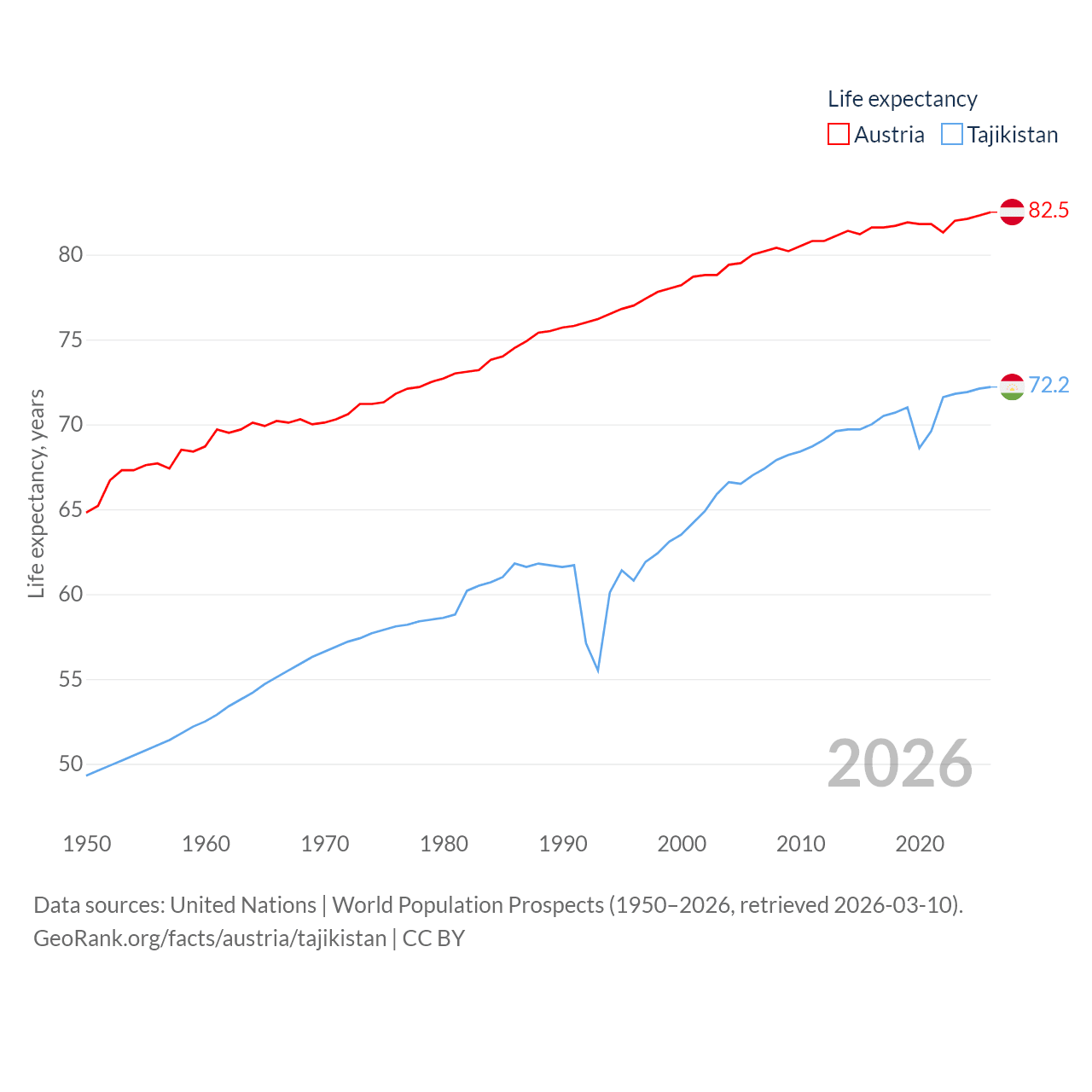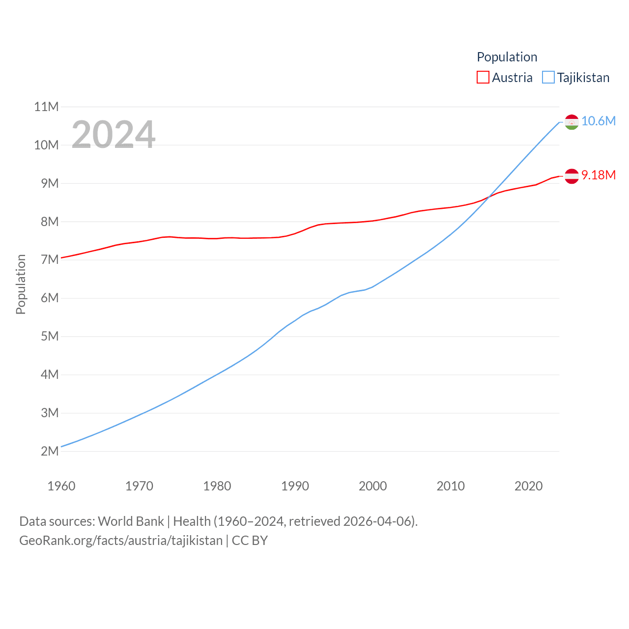 Austria has a population of 9.18M (ranked 99/197), compared with 10.6M in Tajikistan (ranked 91/197). Austria's land area is 31,861 sq mi versus 53,587 sq mi for Tajikistan (ranked 113th vs. 93rd).