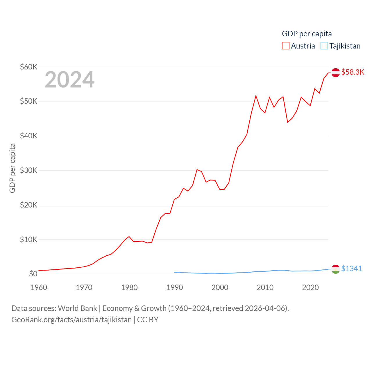 By GDP, Austria ranks 30/197 ($535B) and Tajikistan ranks 145/197 ($14.2B). By GDP per capita, Austria ranks 16/197 ($58,269), while Tajikistan ranks 166/197 ($1,341).