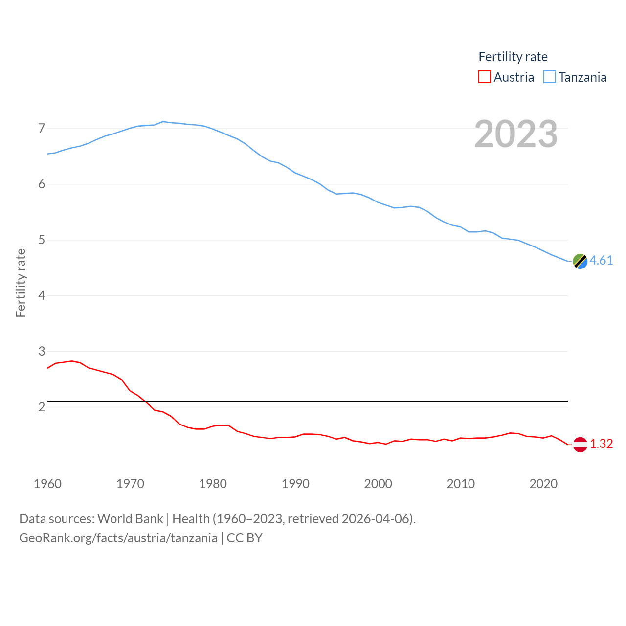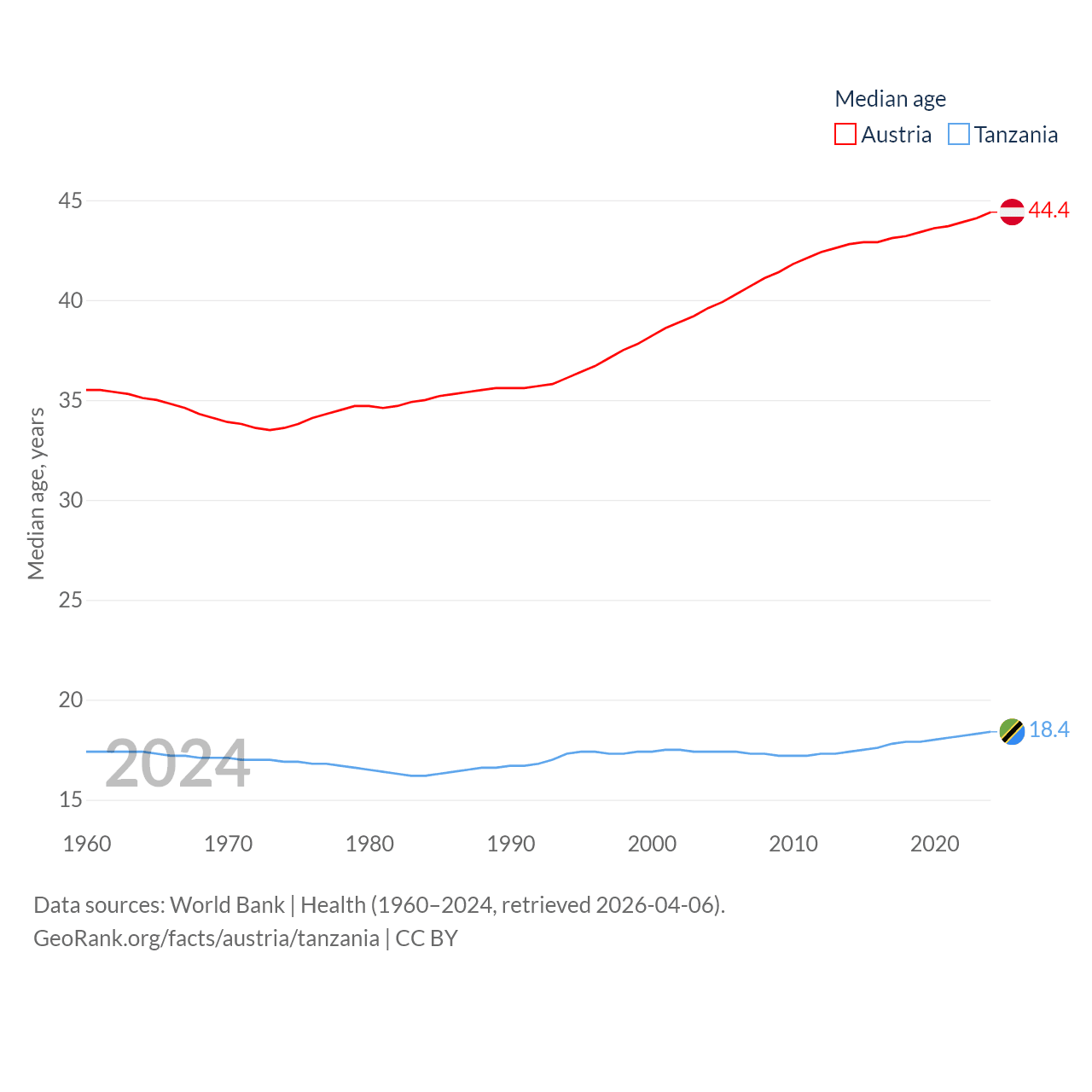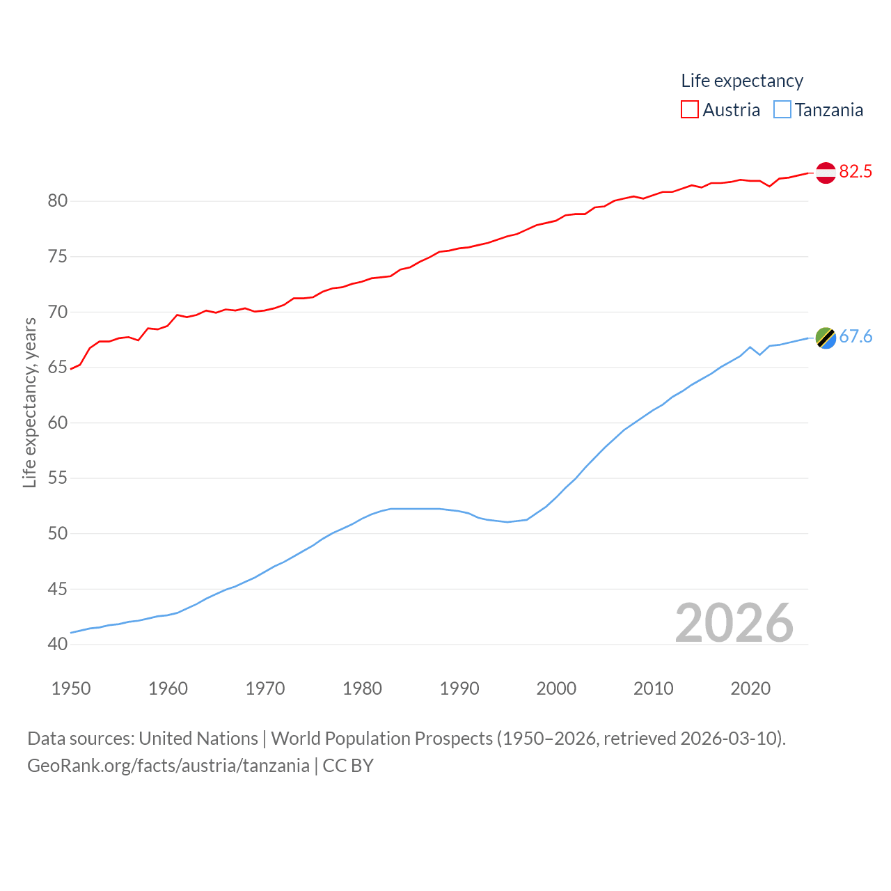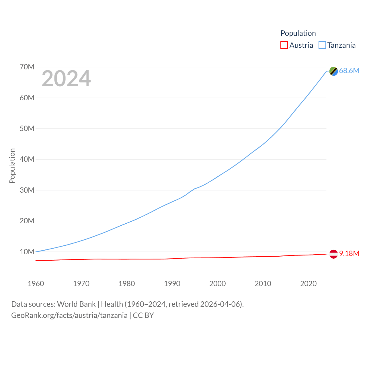 Austria has a population of 9.18M (ranked 99/197), compared with 68.6M in Tanzania (ranked 22/197). Austria's land area is 31,861 sq mi versus 342,009 sq mi for Tanzania (ranked 113th vs. 31st).
