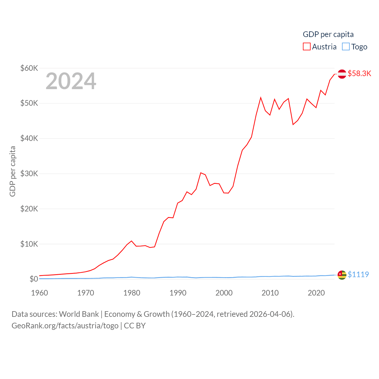 By GDP, Austria ranks 30/197 ($535B) and Togo ranks 154/197 ($10.7B). By GDP per capita, Austria ranks 16/197 ($58,269), while Togo ranks 172/197 ($1,119).