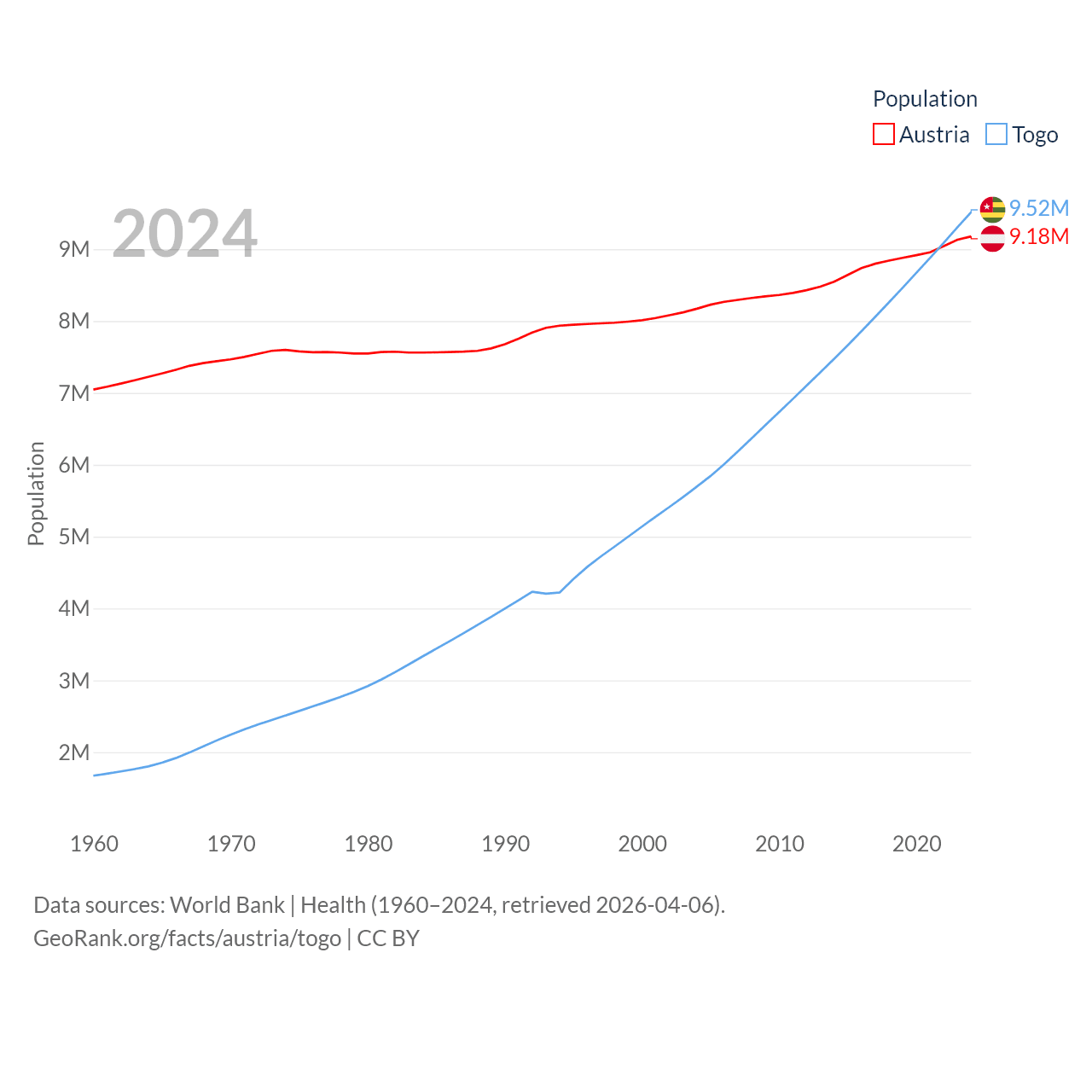 Austria has a population of 9.18M (ranked 99/197), compared with 9.52M in Togo (ranked 98/197). Austria's land area is 31,861 sq mi versus 21,000 sq mi for Togo (ranked 113th vs. 124th).