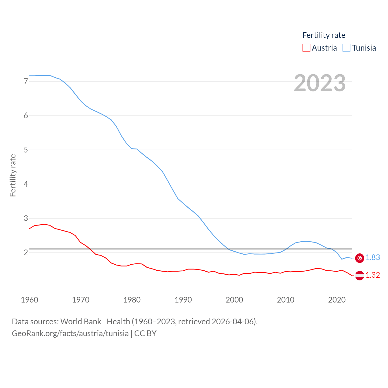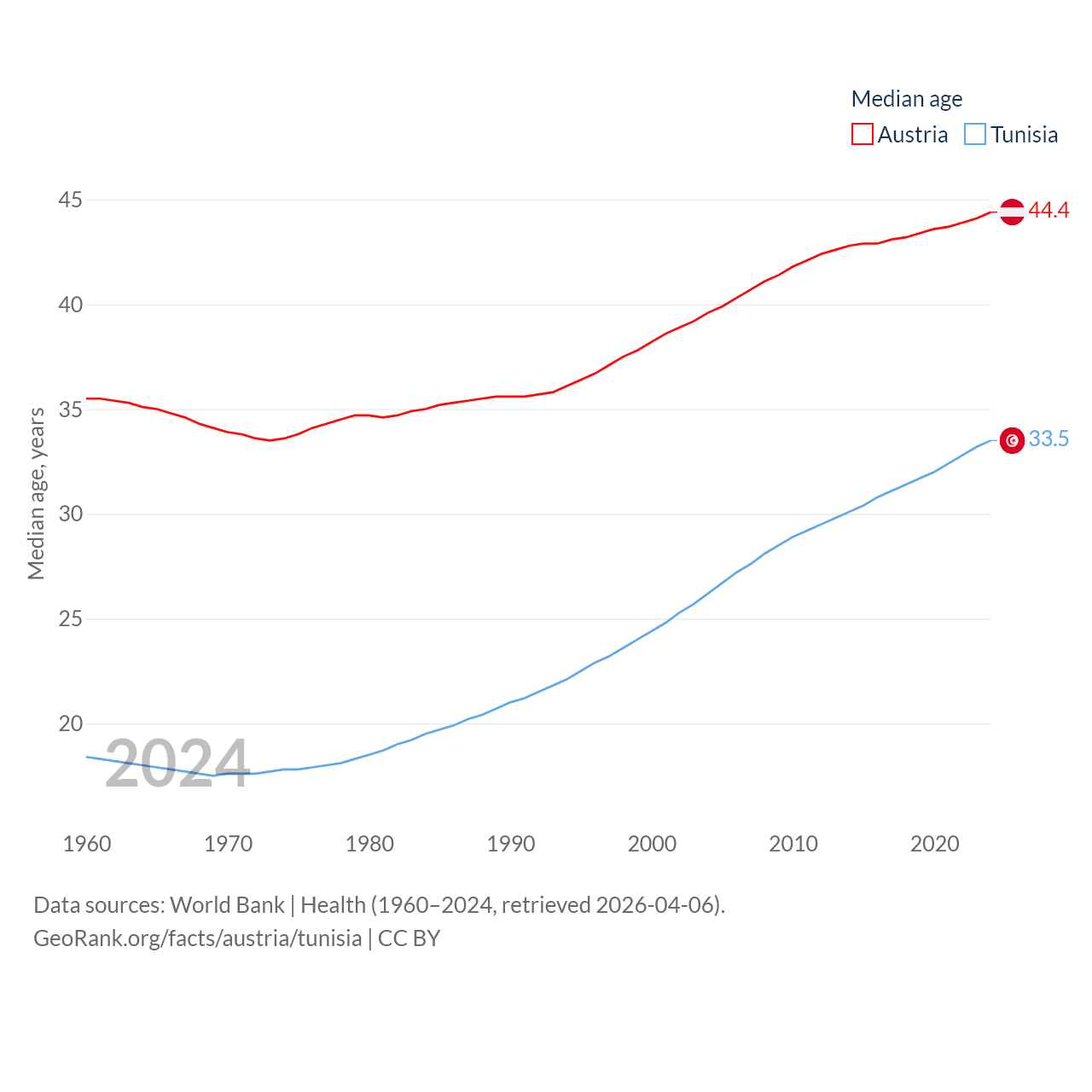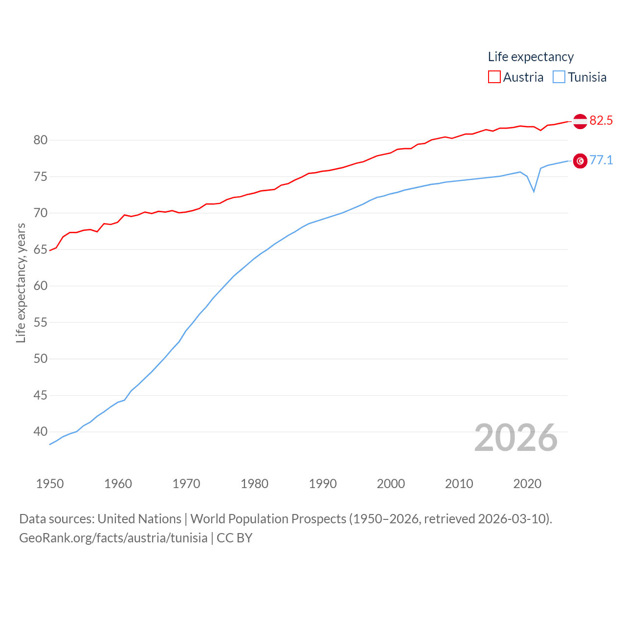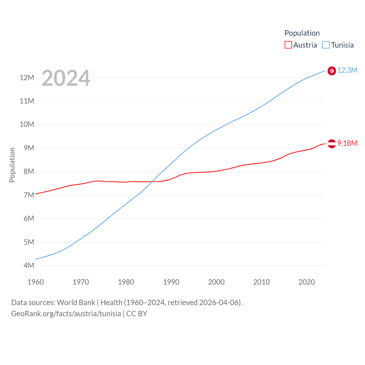 Austria has a population of 9.18M (ranked 99/197), compared with 12.3M in Tunisia (ranked 80/197). Austria's land area is 31,861 sq mi versus 59,985 sq mi for Tunisia (ranked 113th vs. 91st).