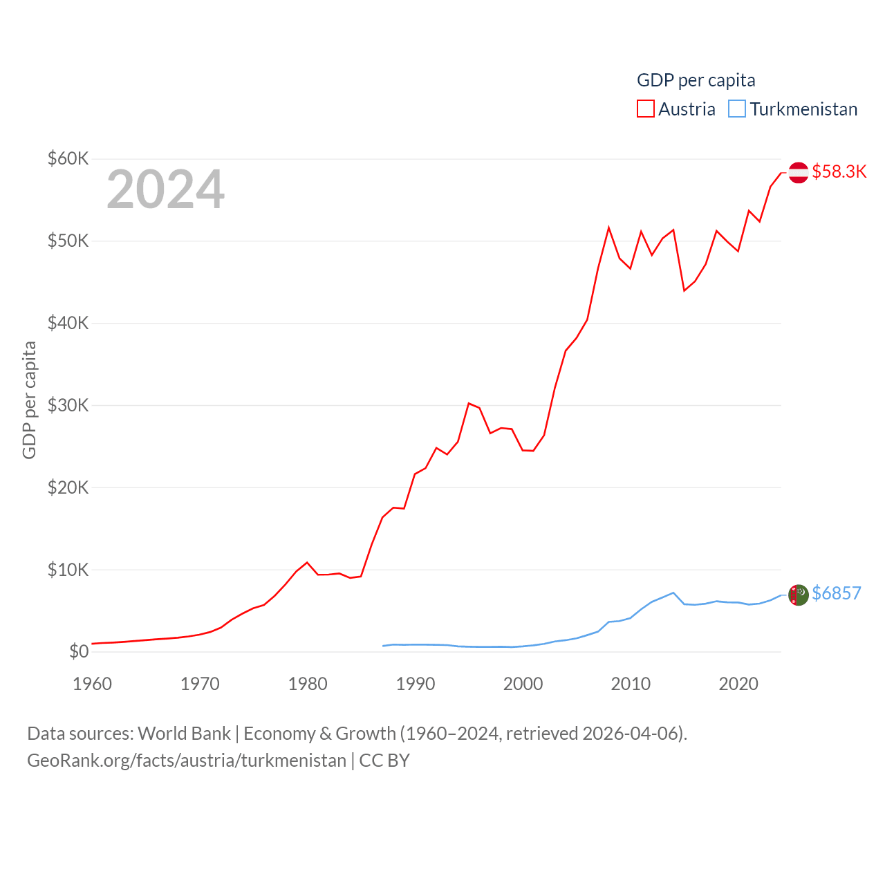 By GDP, Austria ranks 30/197 ($535B) and Turkmenistan ranks 92/197 ($51.4B). By GDP per capita, Austria ranks 16/197 ($58,269), while Turkmenistan ranks 104/197 ($6,857).