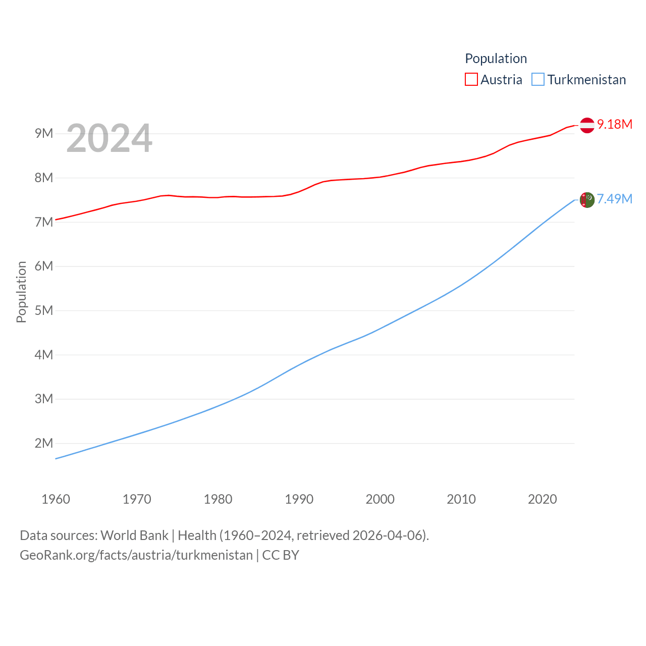 Austria has a population of 9.18M (ranked 99/197), compared with 7.49M in Turkmenistan (ranked 104/197). Austria's land area is 31,861 sq mi versus 181,441 sq mi for Turkmenistan (ranked 113th vs. 53rd).