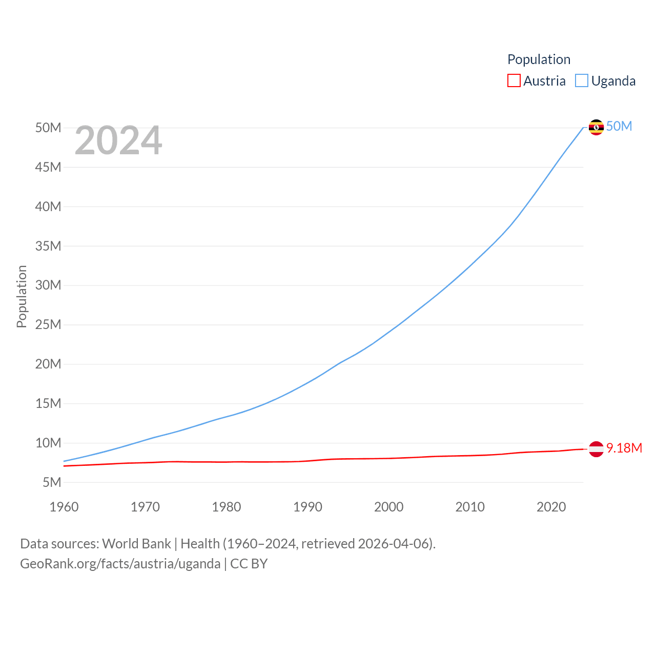 Austria has a population of 9.18M (ranked 99/197), compared with 50M in Uganda (ranked 31/197). Austria's land area is 31,861 sq mi versus 77,421 sq mi for Uganda (ranked 113th vs. 84th).