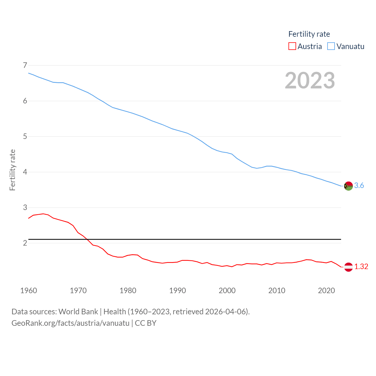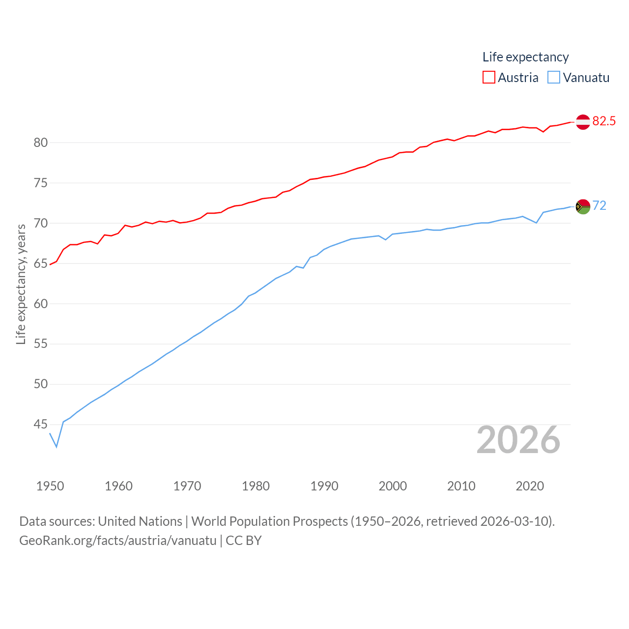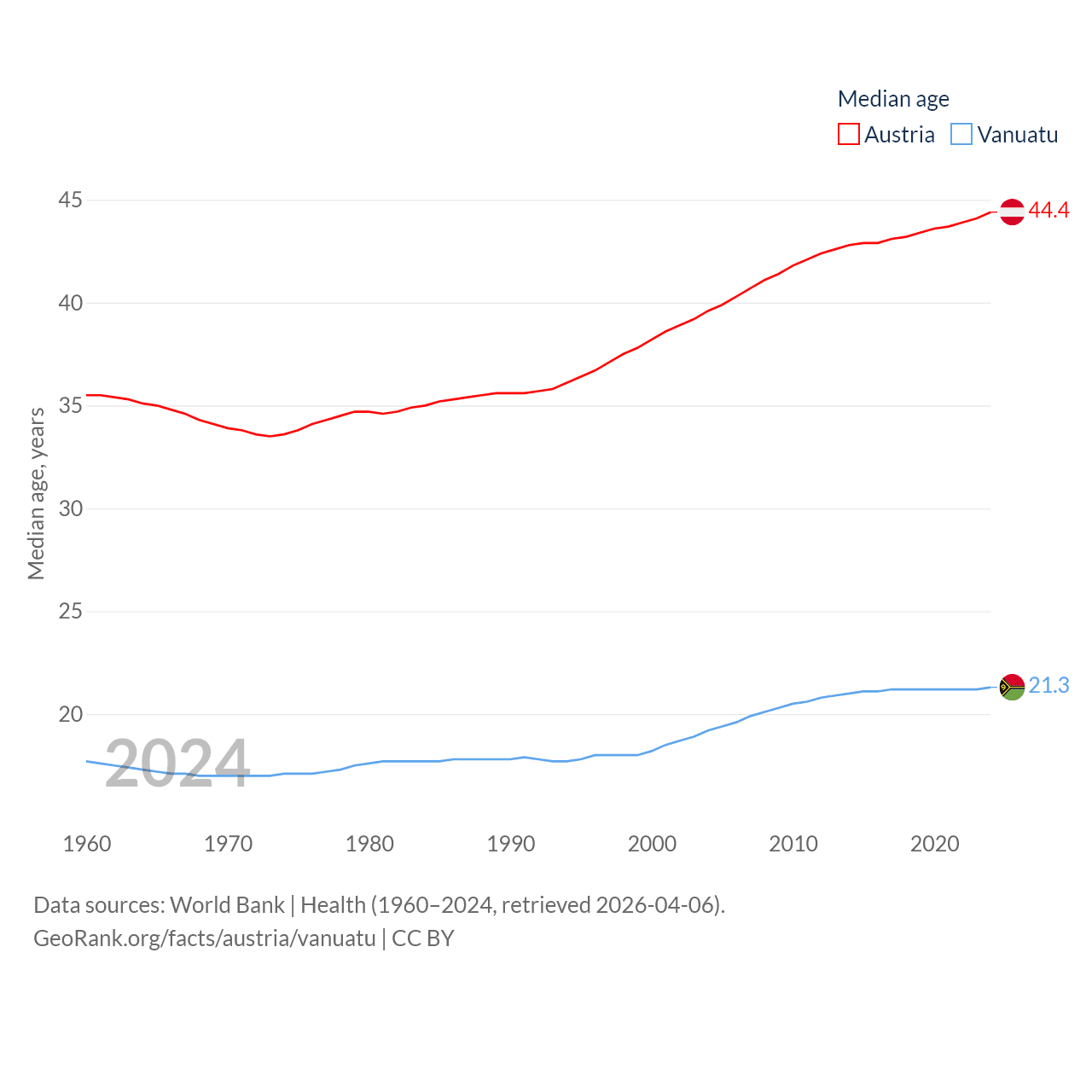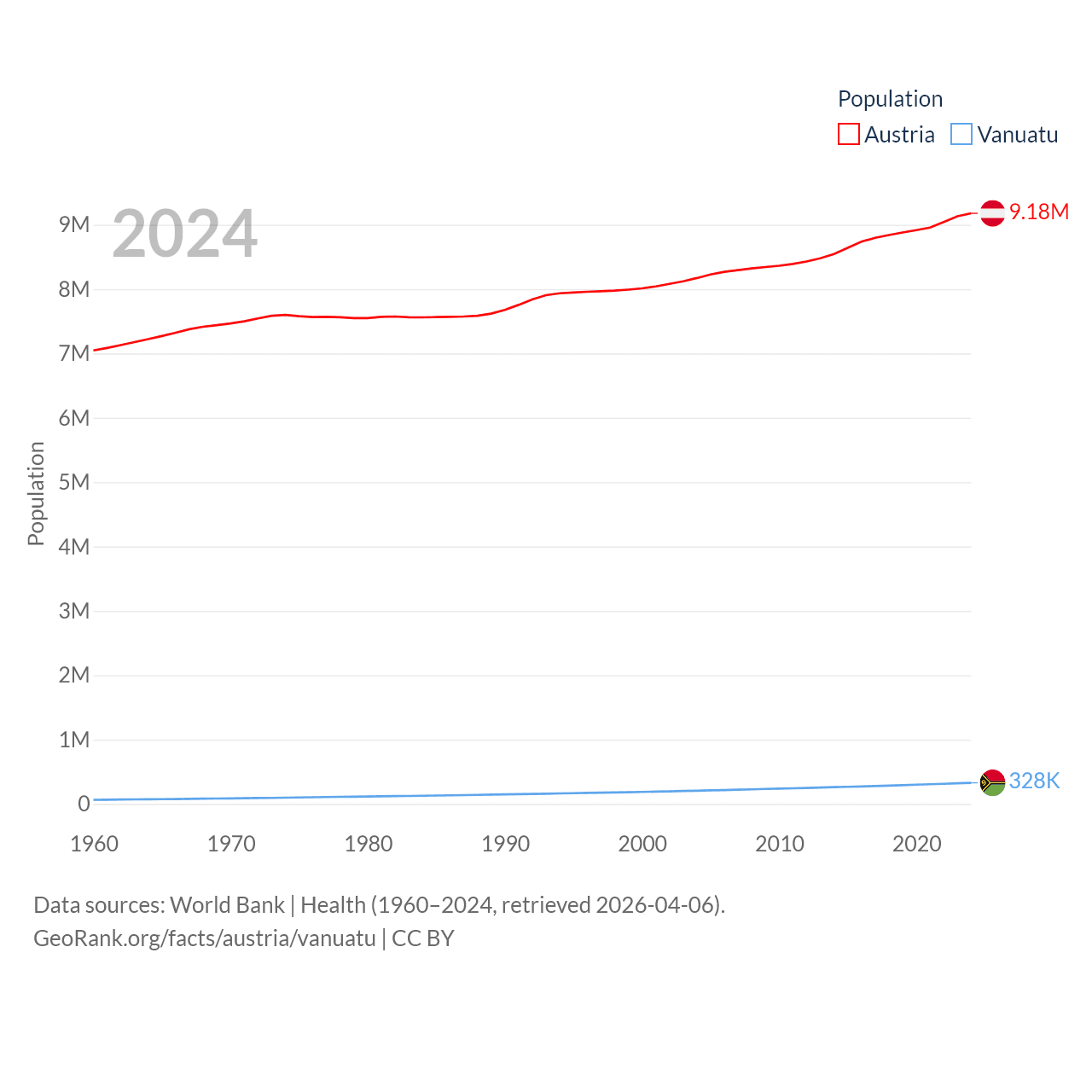 Austria has a population of 9.18M (ranked 99/197), compared with 328K in Vanuatu (ranked 174/197). Austria's land area is 31,861 sq mi versus 4,707 sq mi for Vanuatu (ranked 113th vs. 157th).