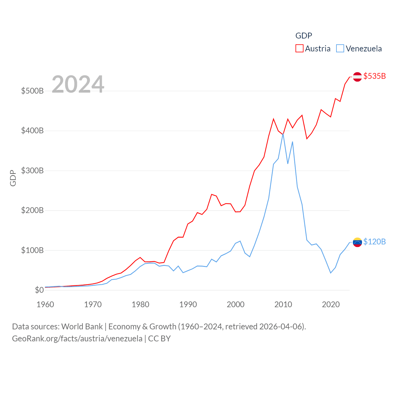 By GDP, Austria ranks 30/197 ($535B) and Venezuela ranks 65/197 ($120B). By GDP per capita, Austria ranks 16/197 ($58,269), while Venezuela ranks 128/197 ($4,218).