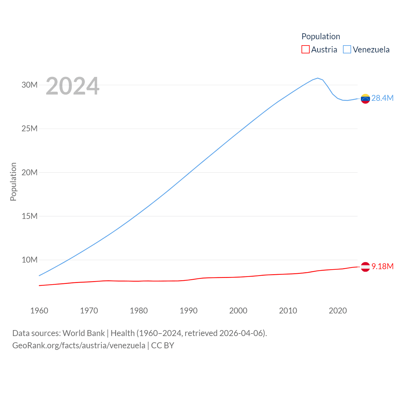 Austria has a population of 9.18M (ranked 99/197), compared with 28.4M in Venezuela (ranked 53/197). Austria's land area is 31,861 sq mi versus 340,561 sq mi for Venezuela (ranked 113th vs. 32nd).