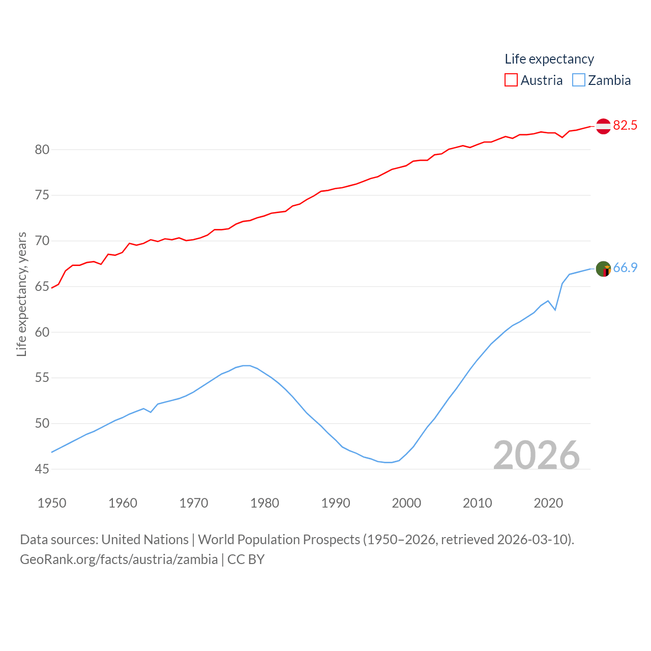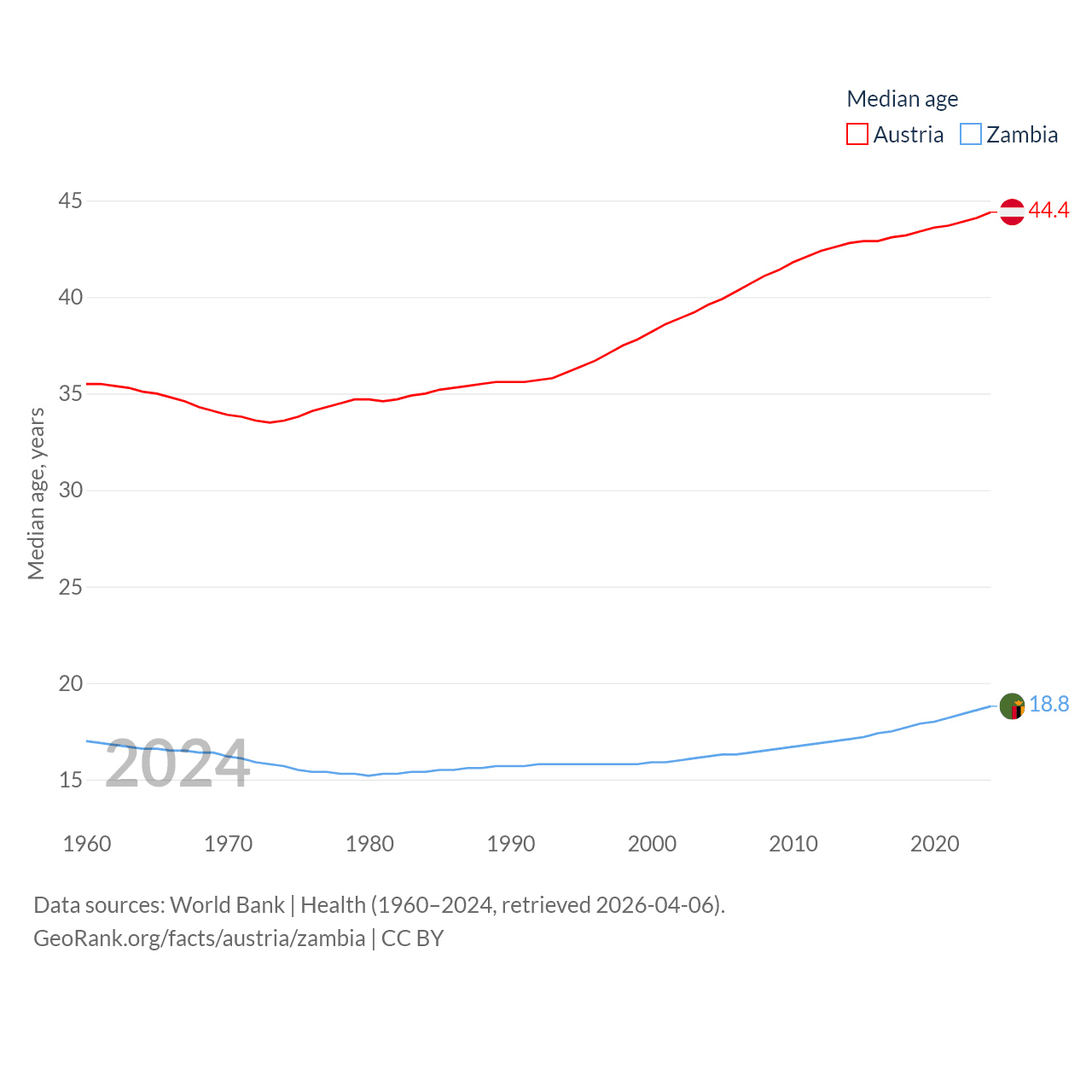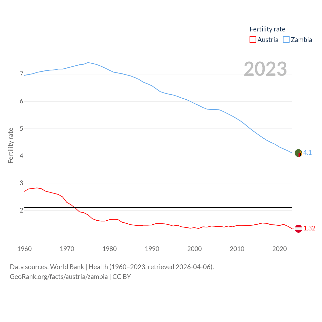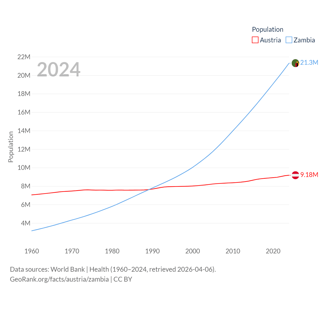 Austria has a population of 9.18M (ranked 99/197), compared with 21.3M in Zambia (ranked 63/197). Austria's land area is 31,861 sq mi versus 287,024 sq mi for Zambia (ranked 113th vs. 37th).