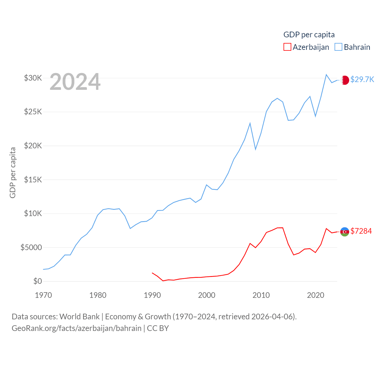 By GDP, Azerbaijan ranks 84/197 ($74.3B) and Bahrain ranks 96/197 ($47.1B). By GDP per capita, Azerbaijan ranks 101/197 ($7,284), while Bahrain ranks 42/197 ($29,654).