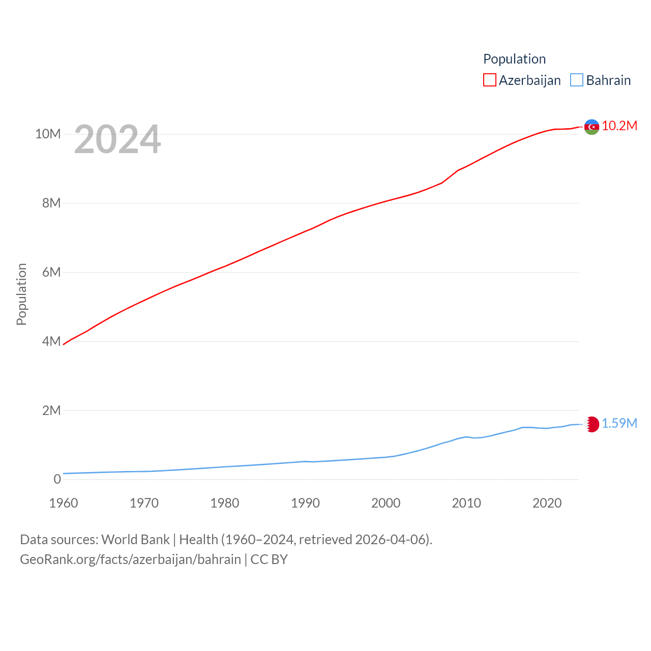 Azerbaijan has a population of 10.2M (ranked 95/197), compared with 1.59M in Bahrain (ranked 151/197). Azerbaijan's land area is 31,911 sq mi versus 309 sq mi for Bahrain (ranked 112th vs. 174th).