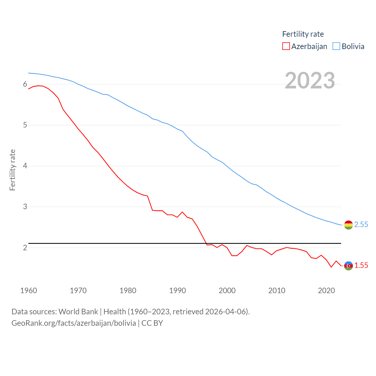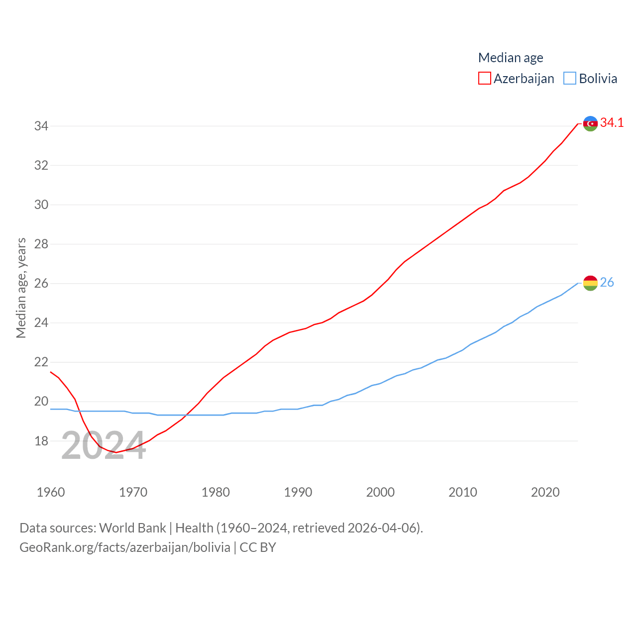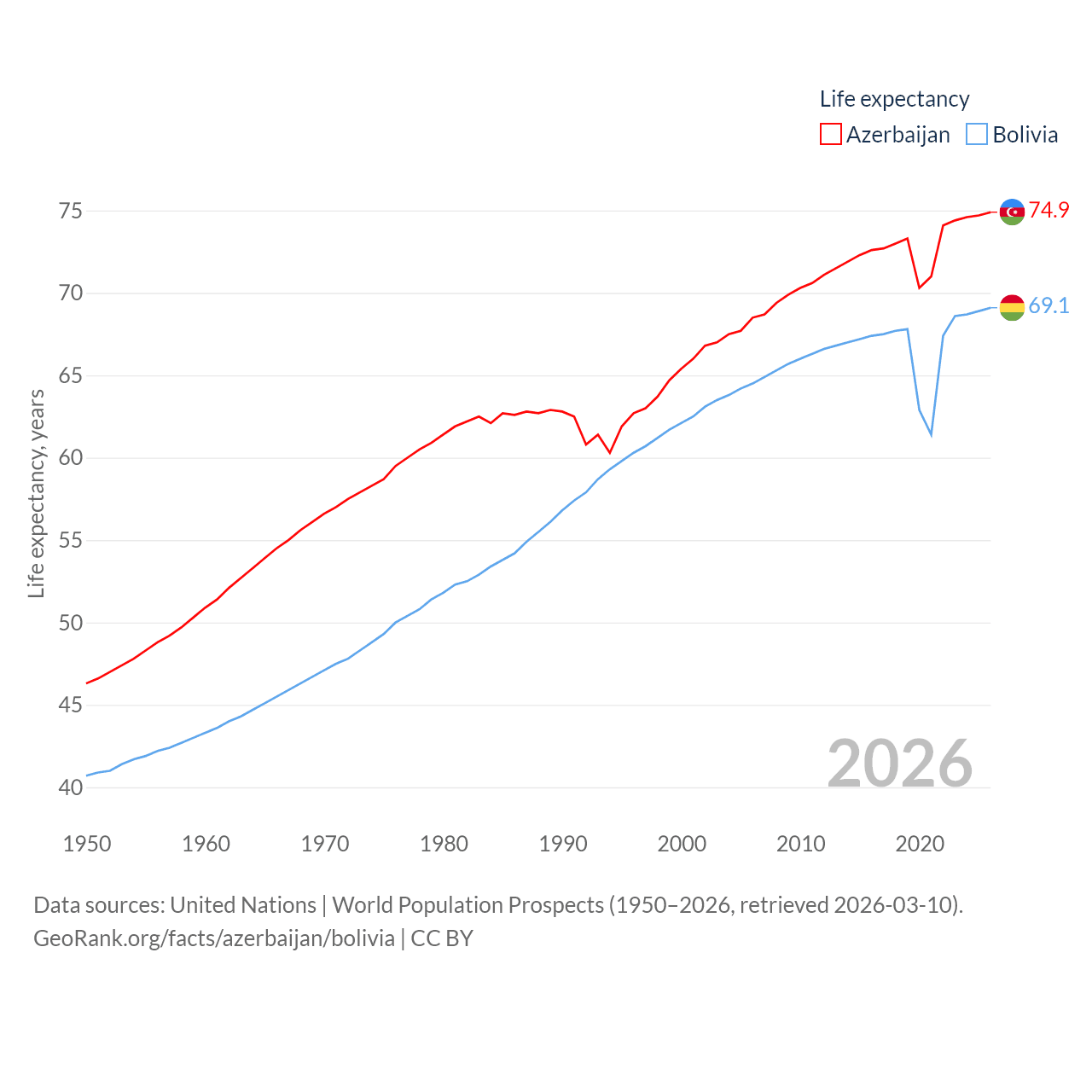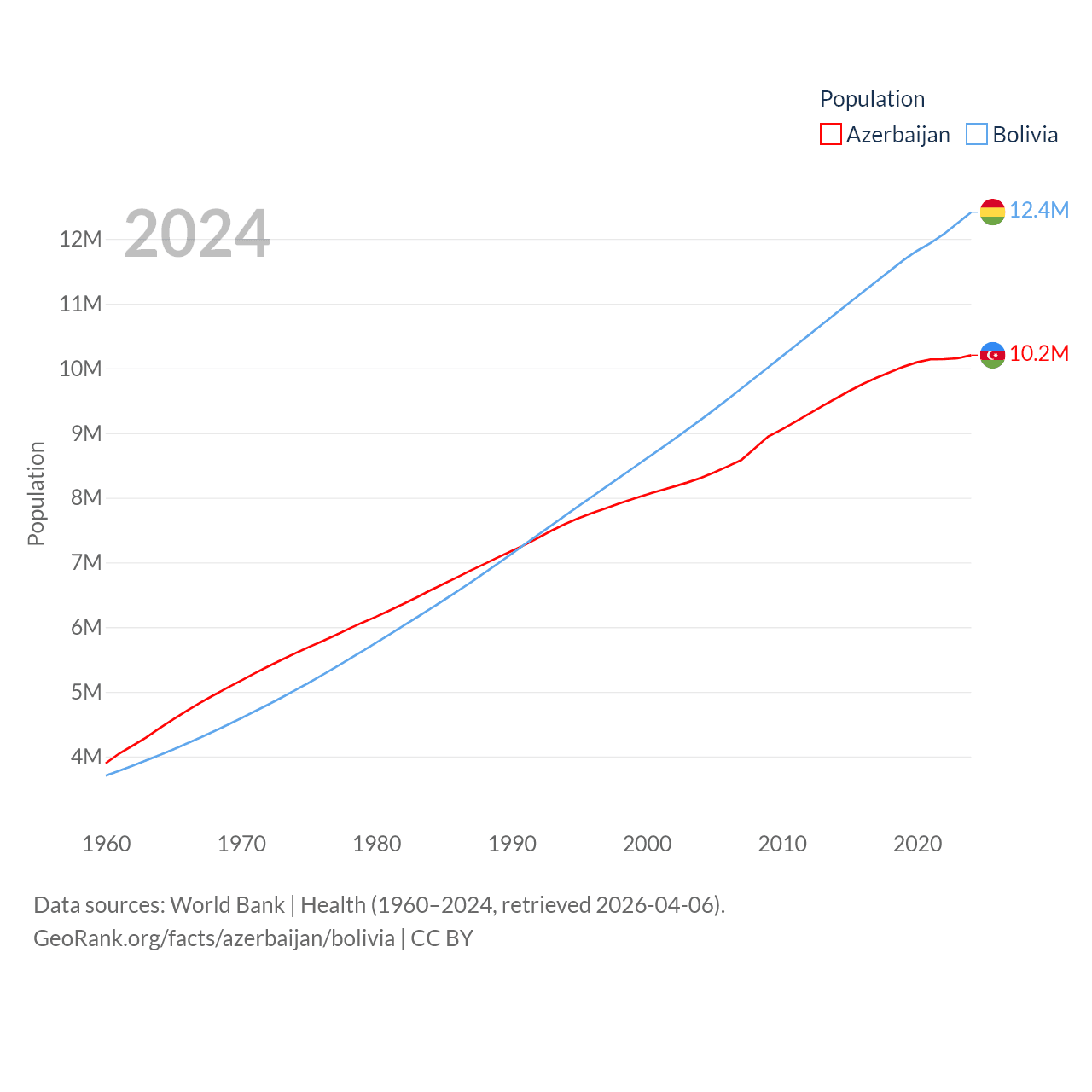 Azerbaijan has a population of 10.2M (ranked 95/197), compared with 12.4M in Bolivia (ranked 79/197). Azerbaijan's land area is 31,911 sq mi versus 418,264 sq mi for Bolivia (ranked 112th vs. 27th).