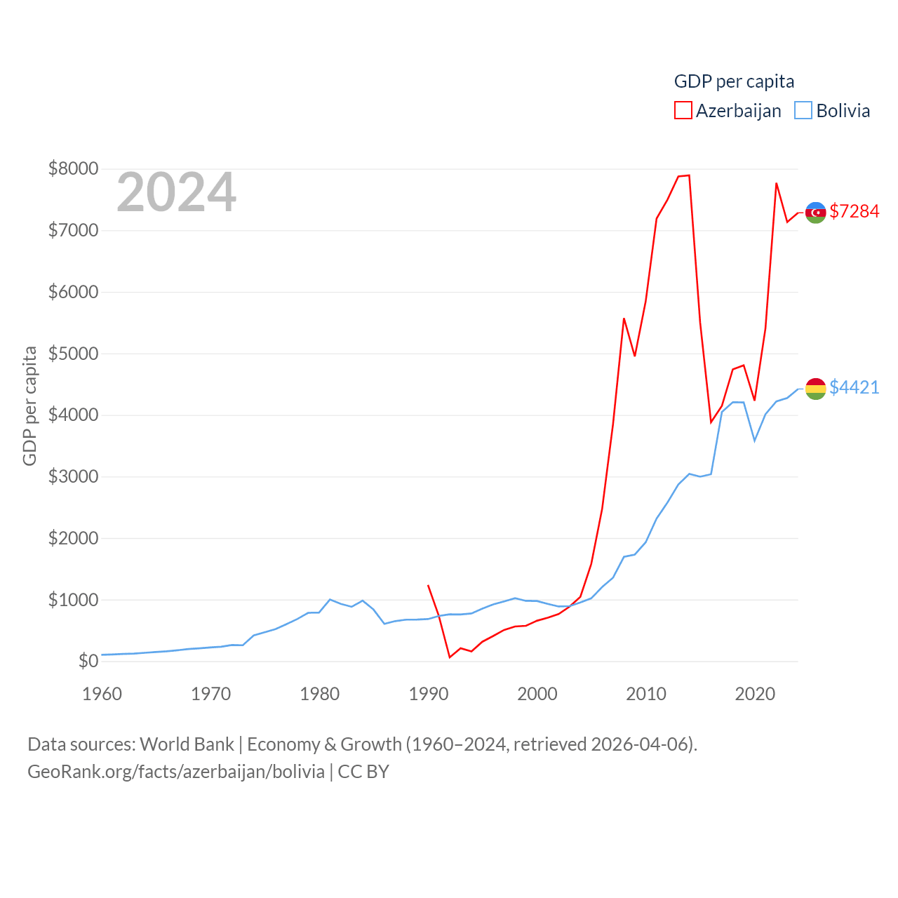 By GDP, Azerbaijan ranks 84/197 ($74.3B) and Bolivia ranks 88/197 ($54.9B). By GDP per capita, Azerbaijan ranks 101/197 ($7,284), while Bolivia ranks 125/197 ($4,421).