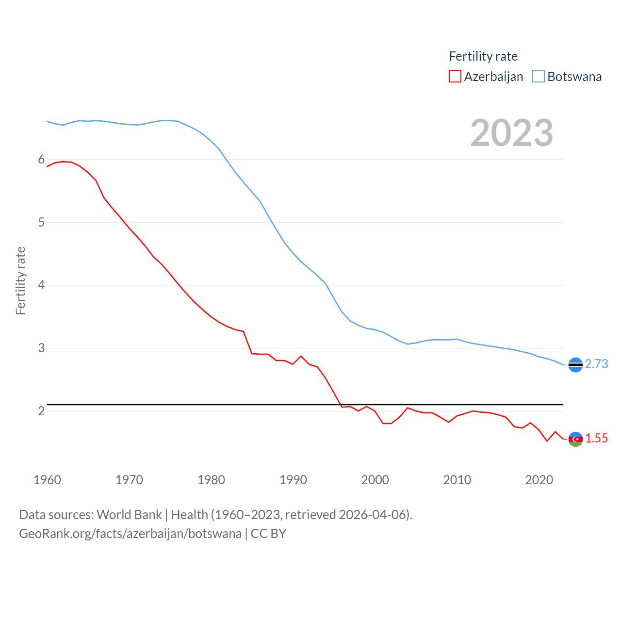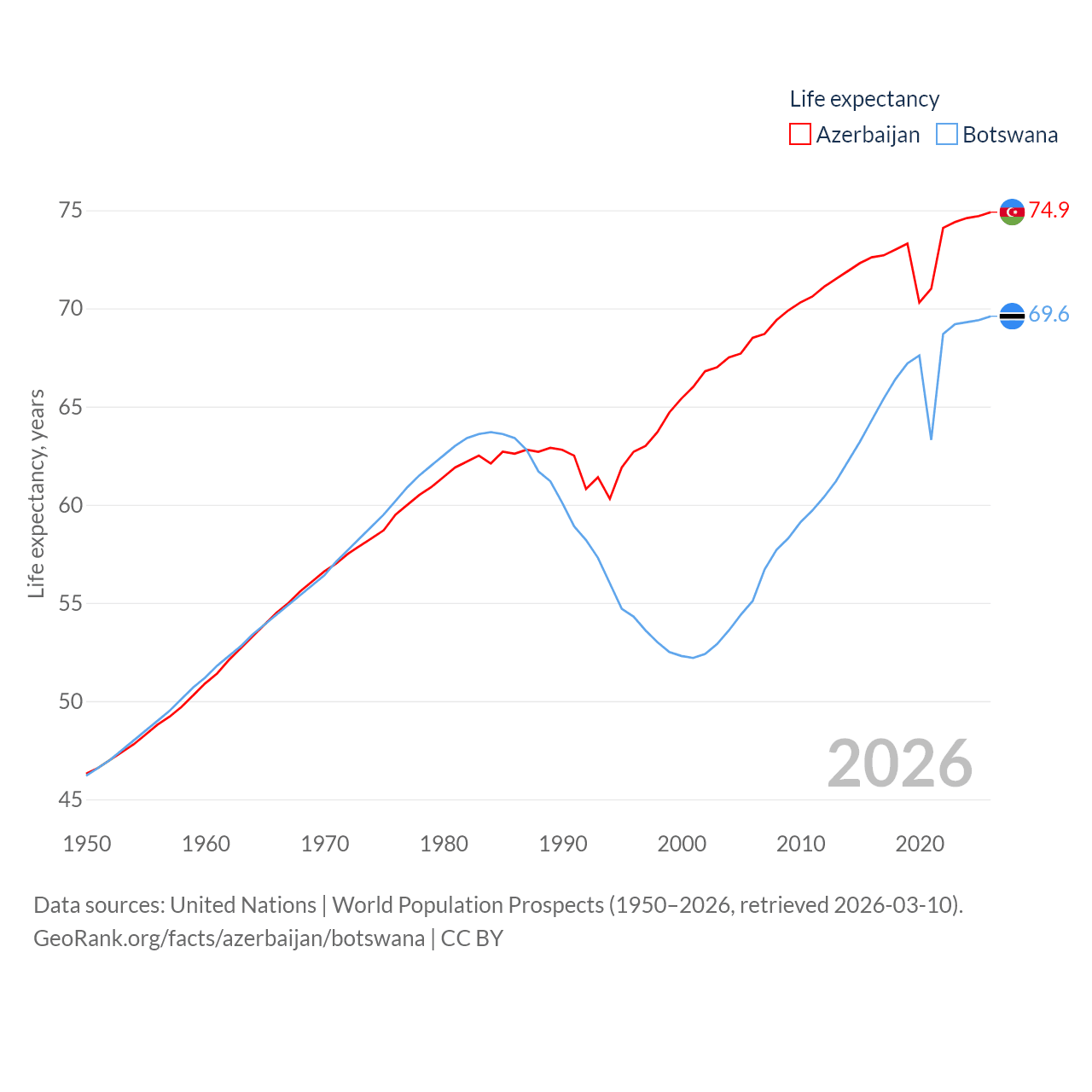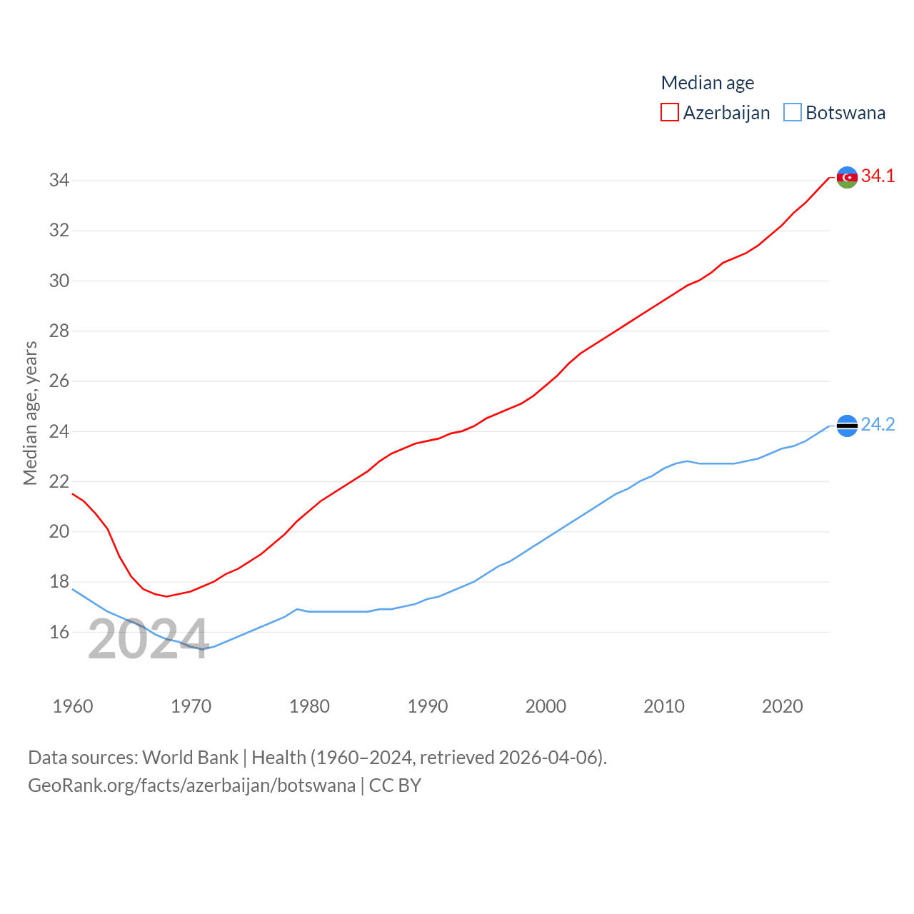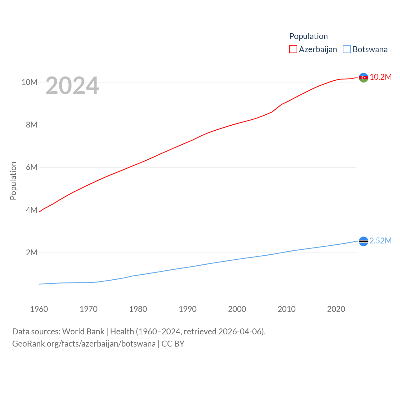 Azerbaijan has a population of 10.2M (ranked 95/197), compared with 2.52M in Botswana (ranked 142/197). Azerbaijan's land area is 31,911 sq mi versus 218,816 sq mi for Botswana (ranked 112th vs. 47th).