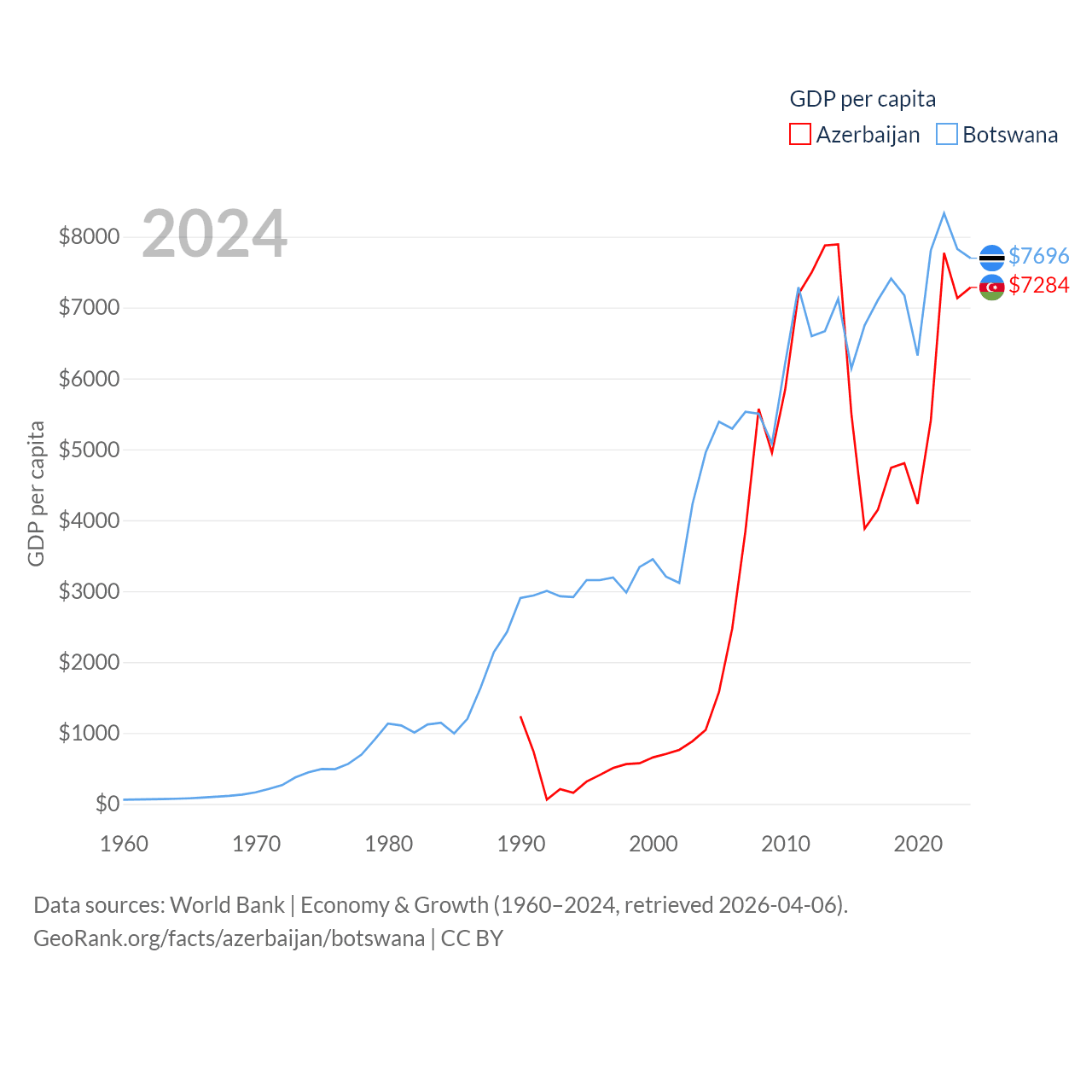 By GDP, Azerbaijan ranks 84/197 ($74.3B) and Botswana ranks 133/197 ($19.4B). By GDP per capita, Azerbaijan ranks 101/197 ($7,284), while Botswana ranks 97/197 ($7,696).