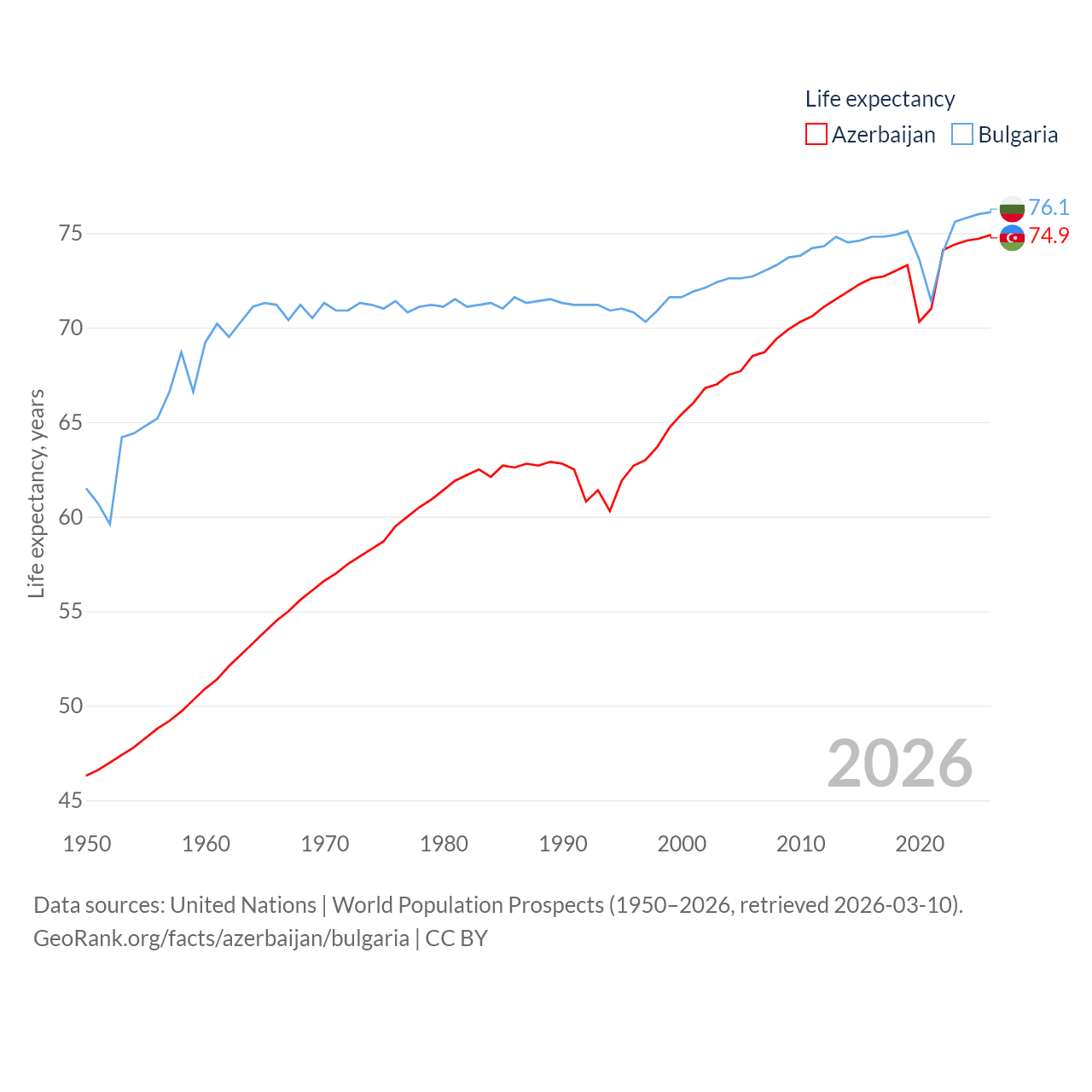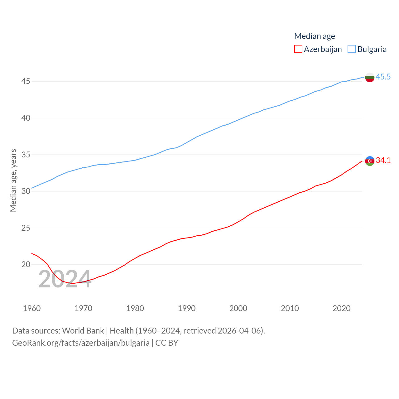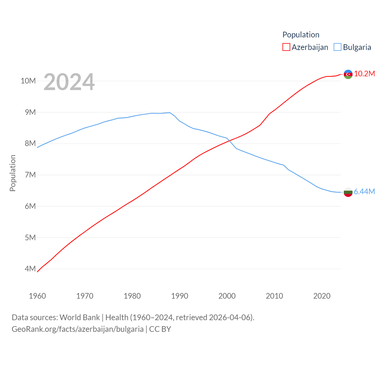 Azerbaijan has a population of 10.2M (ranked 95/197), compared with 6.44M in Bulgaria (ranked 110/197). Azerbaijan's land area is 31,911 sq mi versus 41,915 sq mi for Bulgaria (ranked 112th vs. 101st).