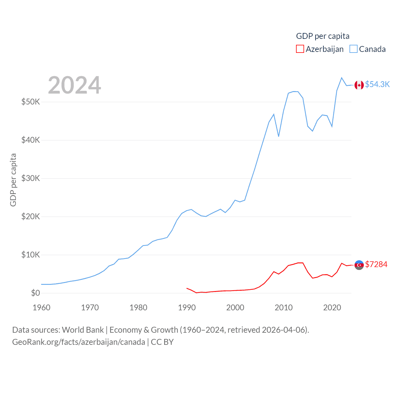 By GDP, Azerbaijan ranks 84/197 ($74.3B) and Canada ranks 9/197 ($2.24T). By GDP per capita, Azerbaijan ranks 101/197 ($7,284), while Canada ranks 20/197 ($54,340).
