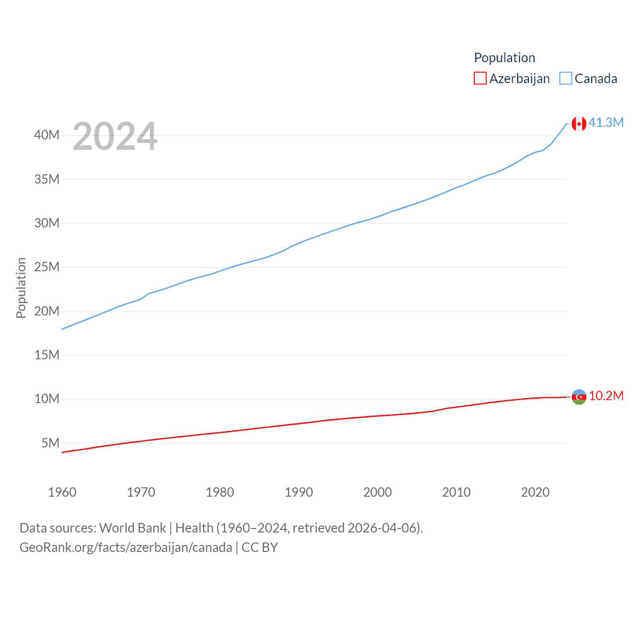 Azerbaijan has a population of 10.2M (ranked 95/197), compared with 41.3M in Canada (ranked 37/197). Azerbaijan's land area is 31,911 sq mi versus 3,393,336 sq mi for Canada (ranked 112th vs. 4th).