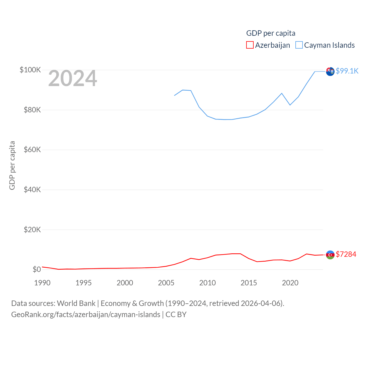 By GDP, Azerbaijan ranks 84/197 ($74.3B) and The Cayman Islands ranks 158/197 ($7.24B). By GDP per capita, Azerbaijan ranks 101/197 ($7,284), while The Cayman Islands ranks 6/197 ($99,144).