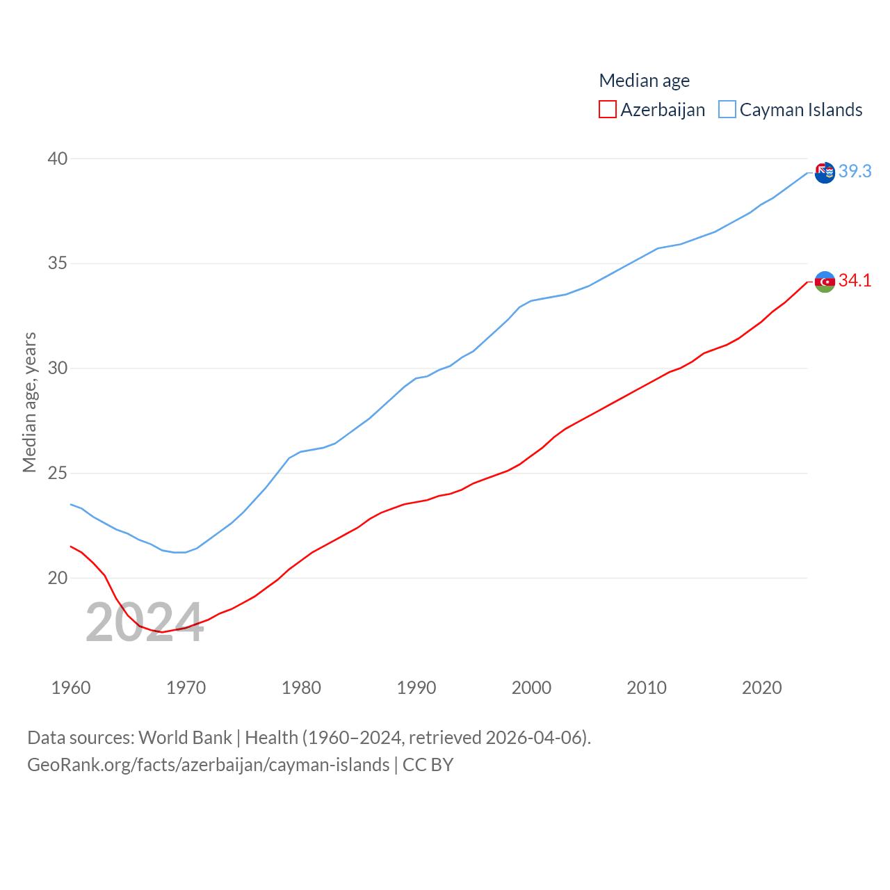 Azerbaijan has a population of 10.2M (ranked 95/197), compared with 74.5K in The Cayman Islands (ranked 187/197). Azerbaijan's land area is 31,911 sq mi versus 92.7 sq mi for The Cayman Islands (ranked 112th vs. 190th).