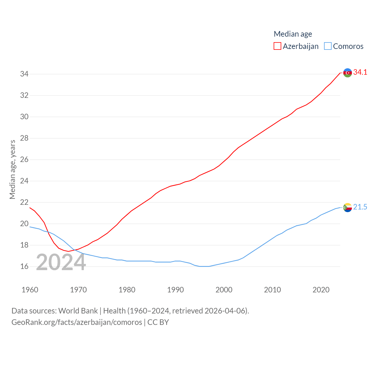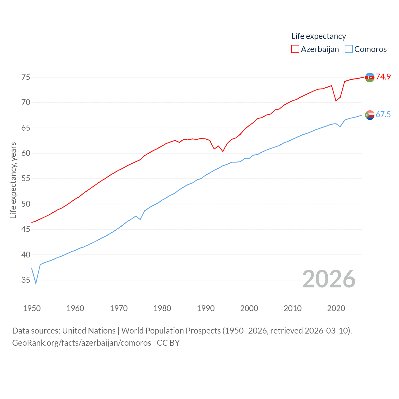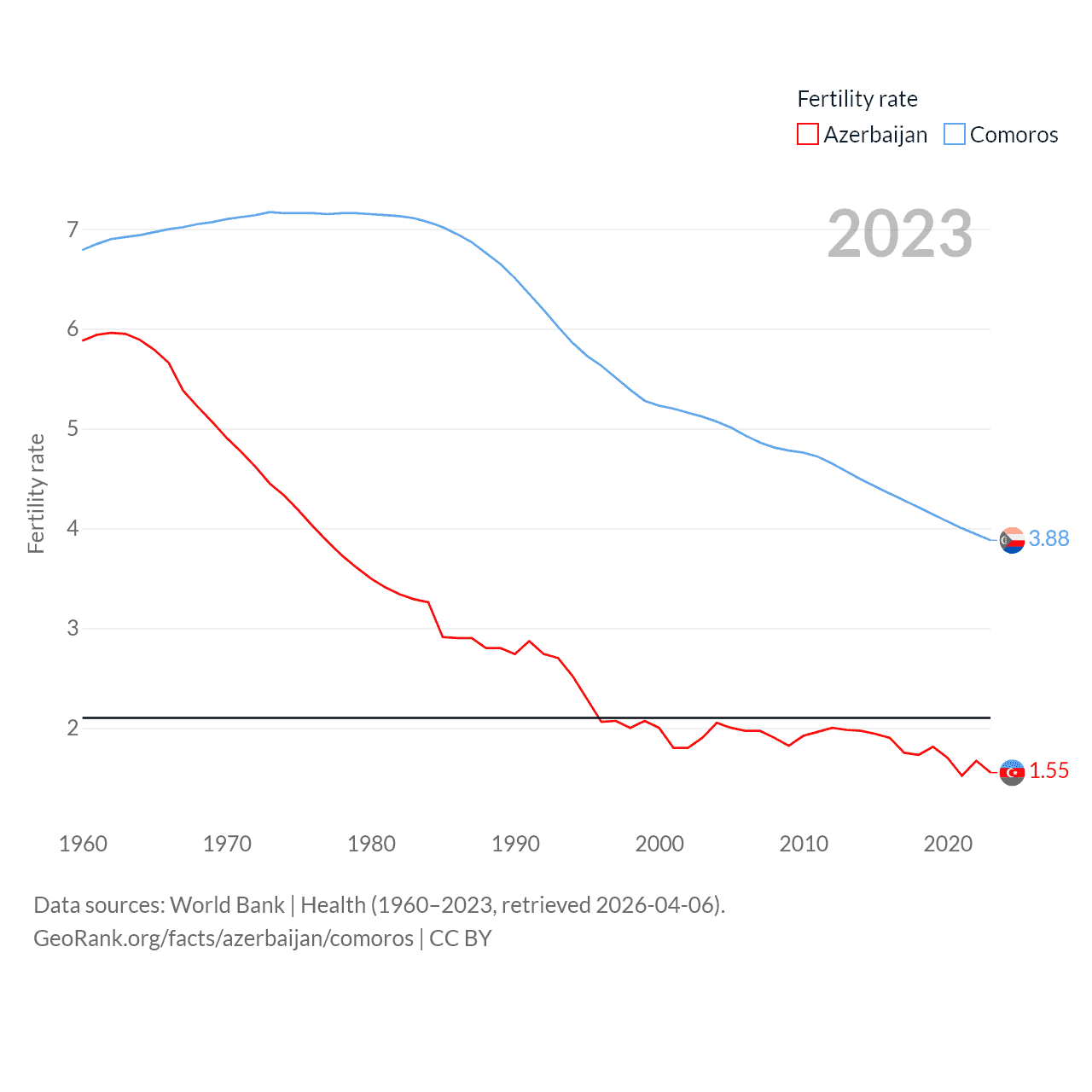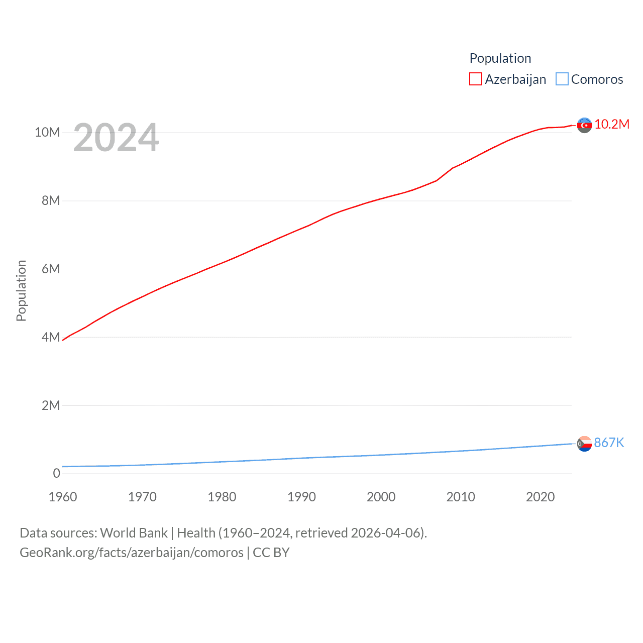 Azerbaijan has a population of 10.2M (ranked 95/197), compared with 867K in Comoros (ranked 160/197). Azerbaijan's land area is 31,911 sq mi versus 719 sq mi for Comoros (ranked 112th vs. 171st).
