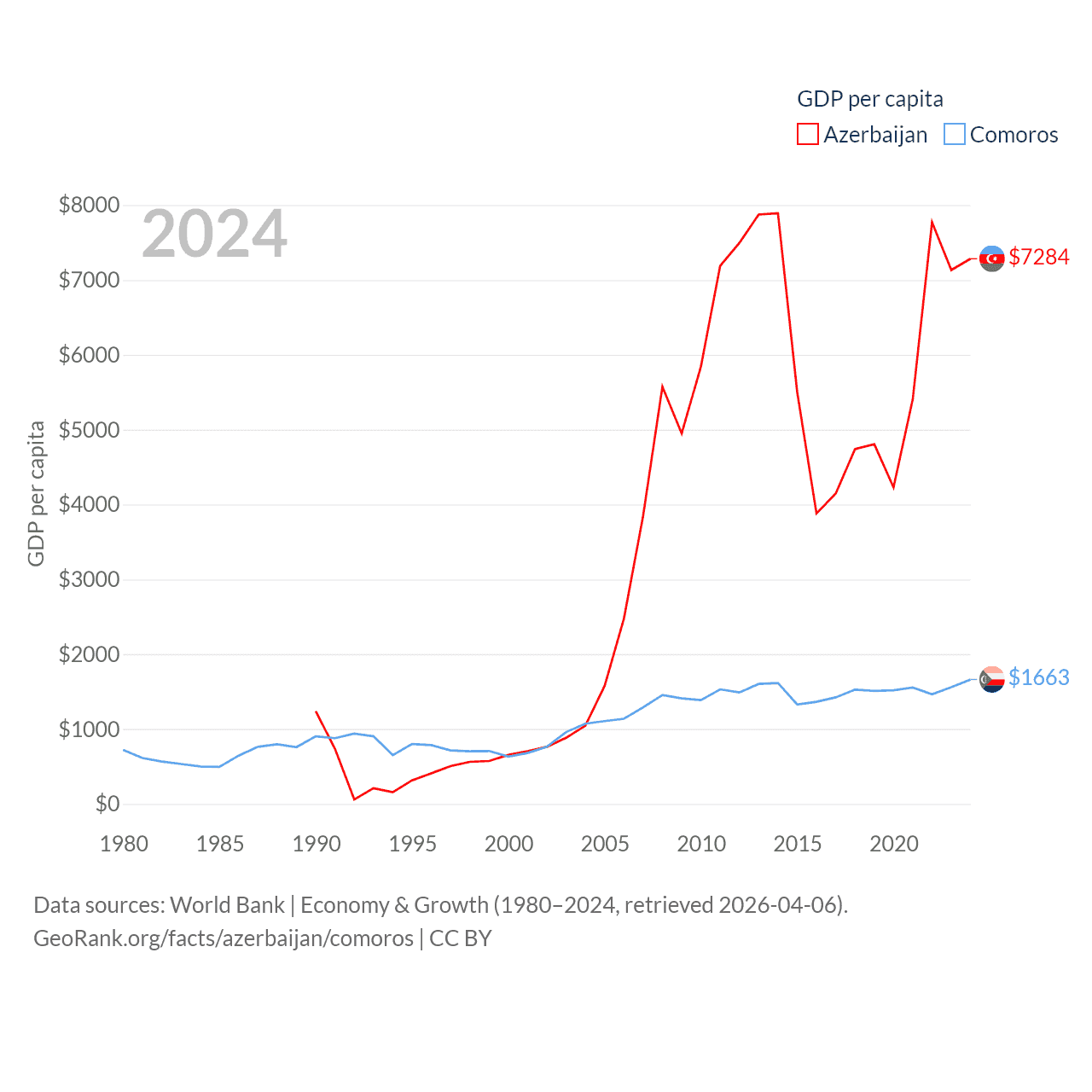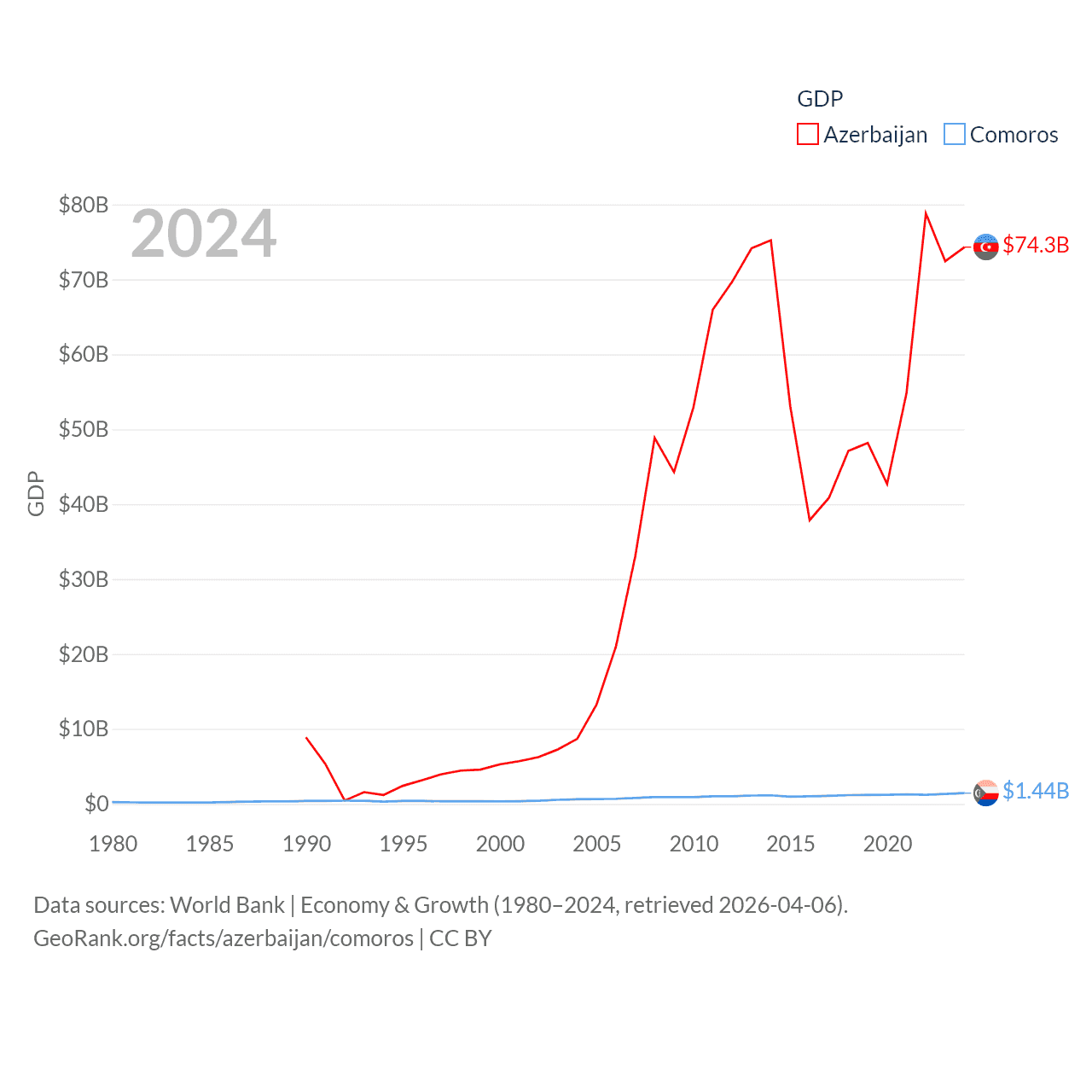 By GDP, Azerbaijan ranks 84/197 ($74.3B) and Comoros ranks 183/197 ($1.44B). By GDP per capita, Azerbaijan ranks 101/197 ($7,284), while Comoros ranks 161/197 ($1,663).