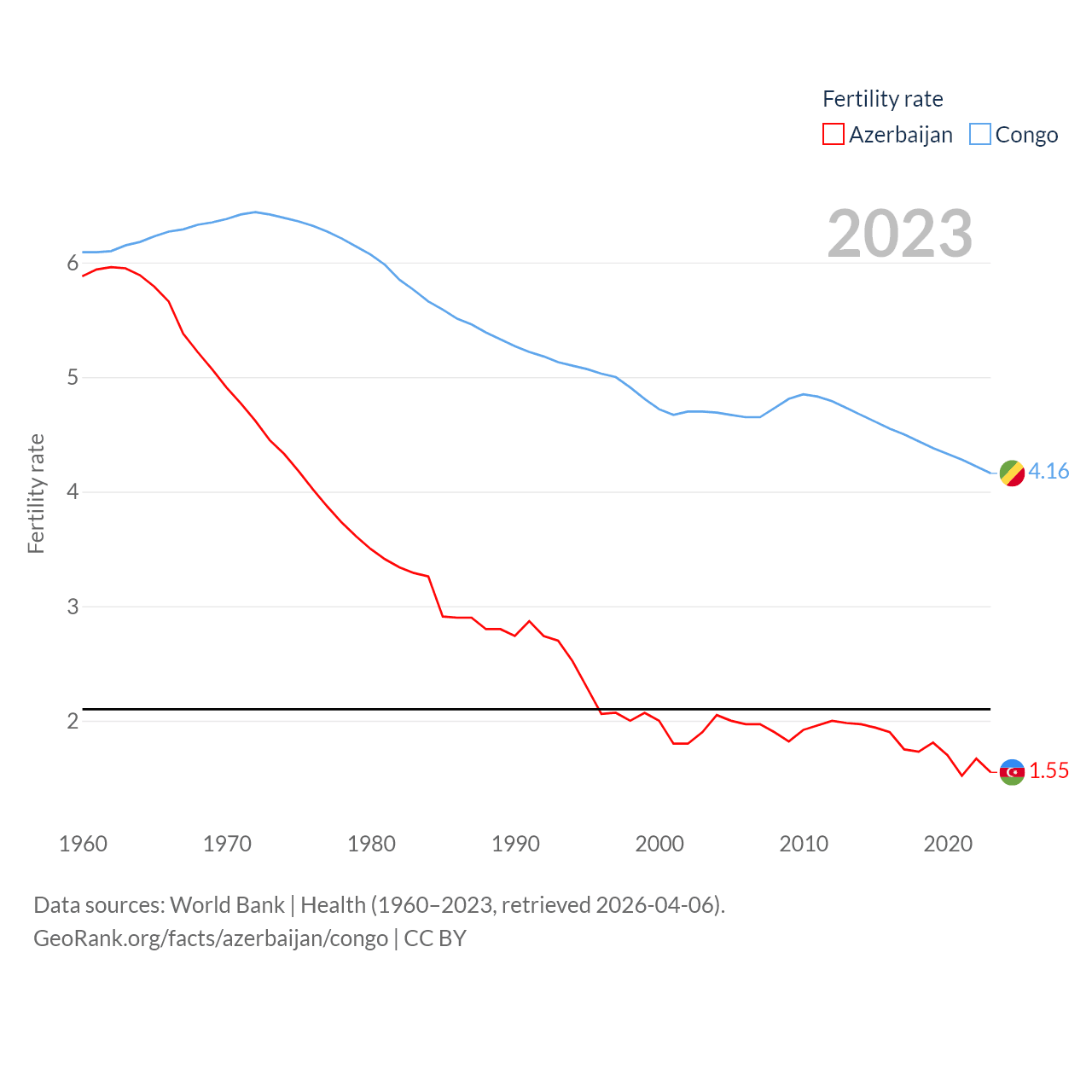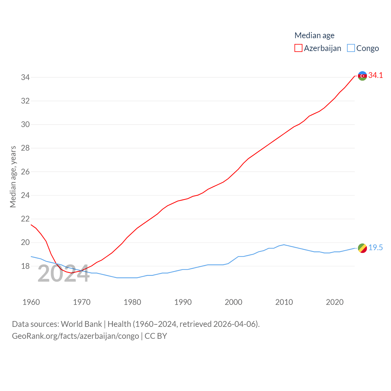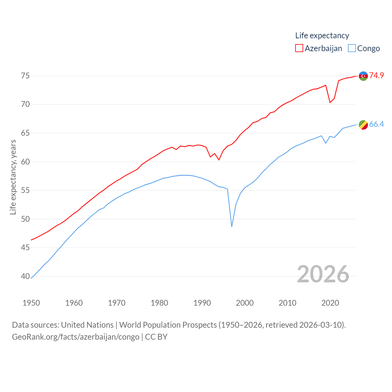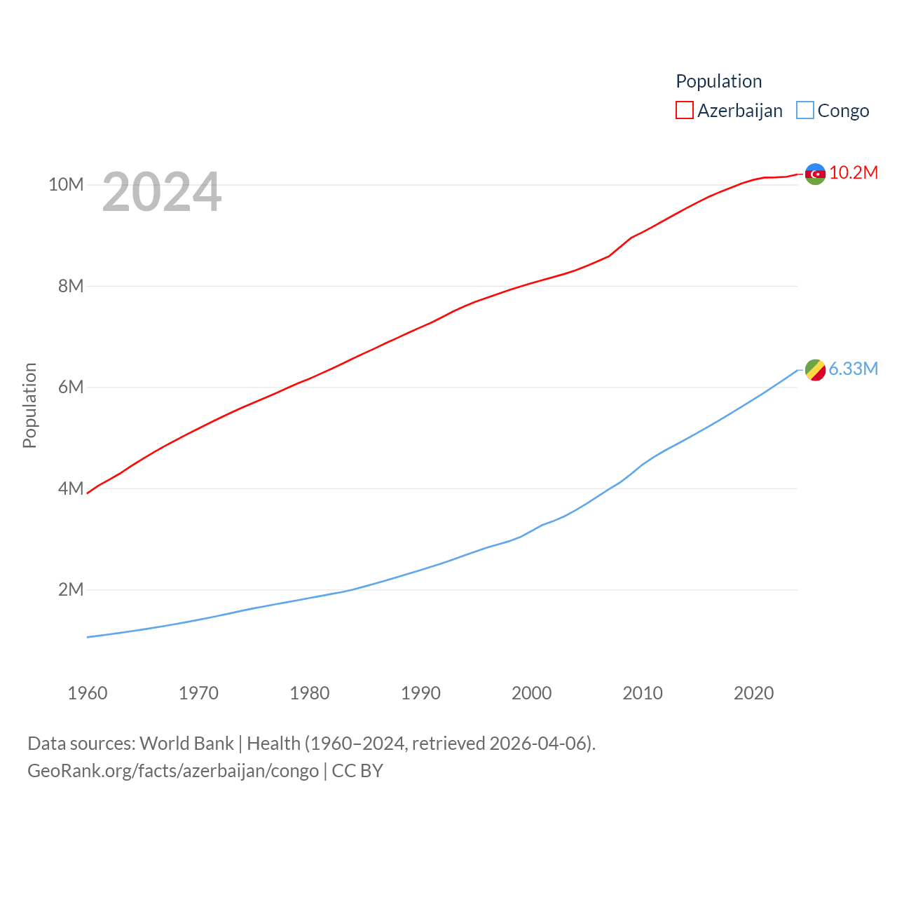 Azerbaijan has a population of 10.2M (ranked 95/197), compared with 6.33M in The Congo (ranked 112/197). Azerbaijan's land area is 31,911 sq mi versus 131,854 sq mi for The Congo (ranked 112th vs. 64th).