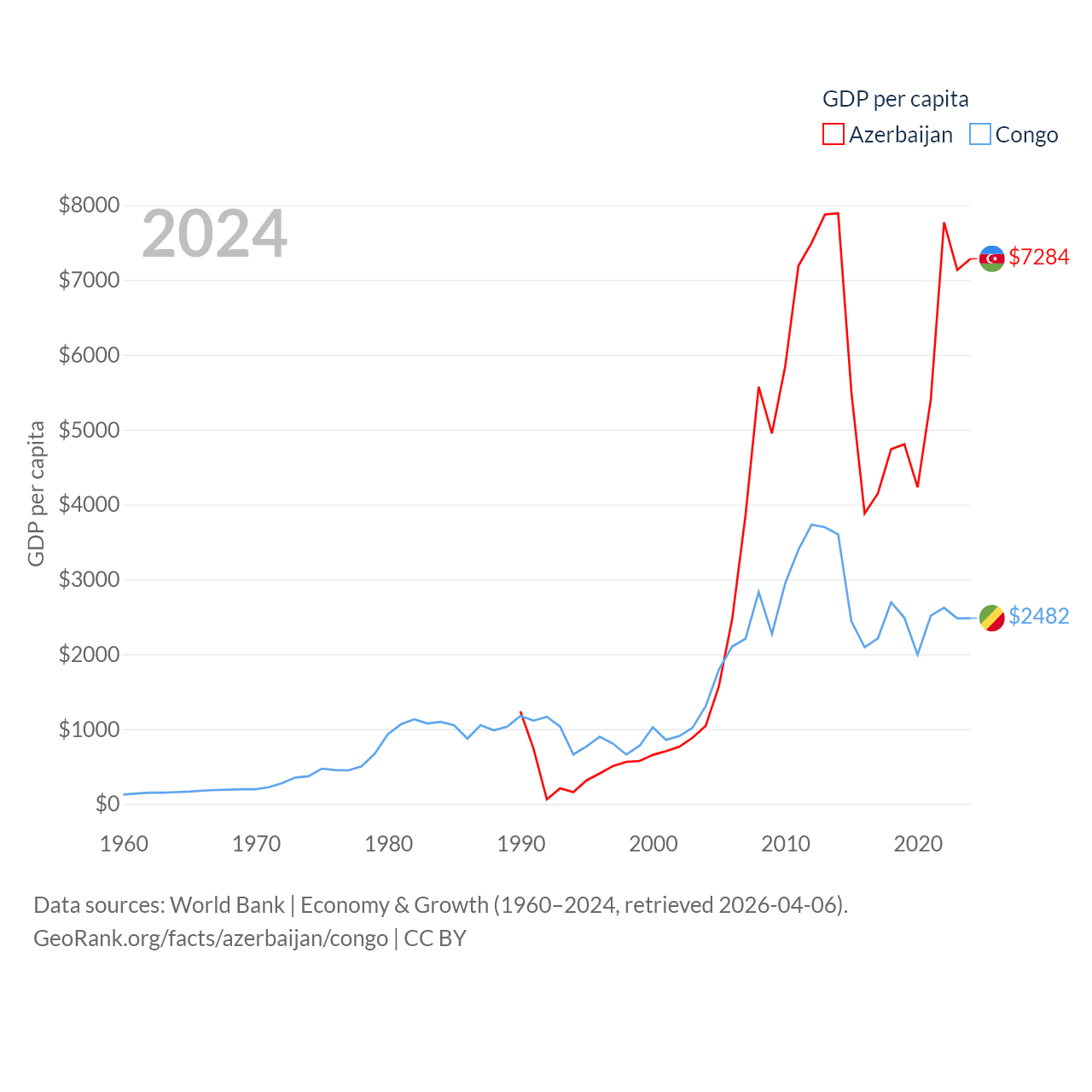By GDP, Azerbaijan ranks 84/197 ($74.3B) and The Congo ranks 141/197 ($15.7B). By GDP per capita, Azerbaijan ranks 101/197 ($7,284), while The Congo ranks 149/197 ($2,482).