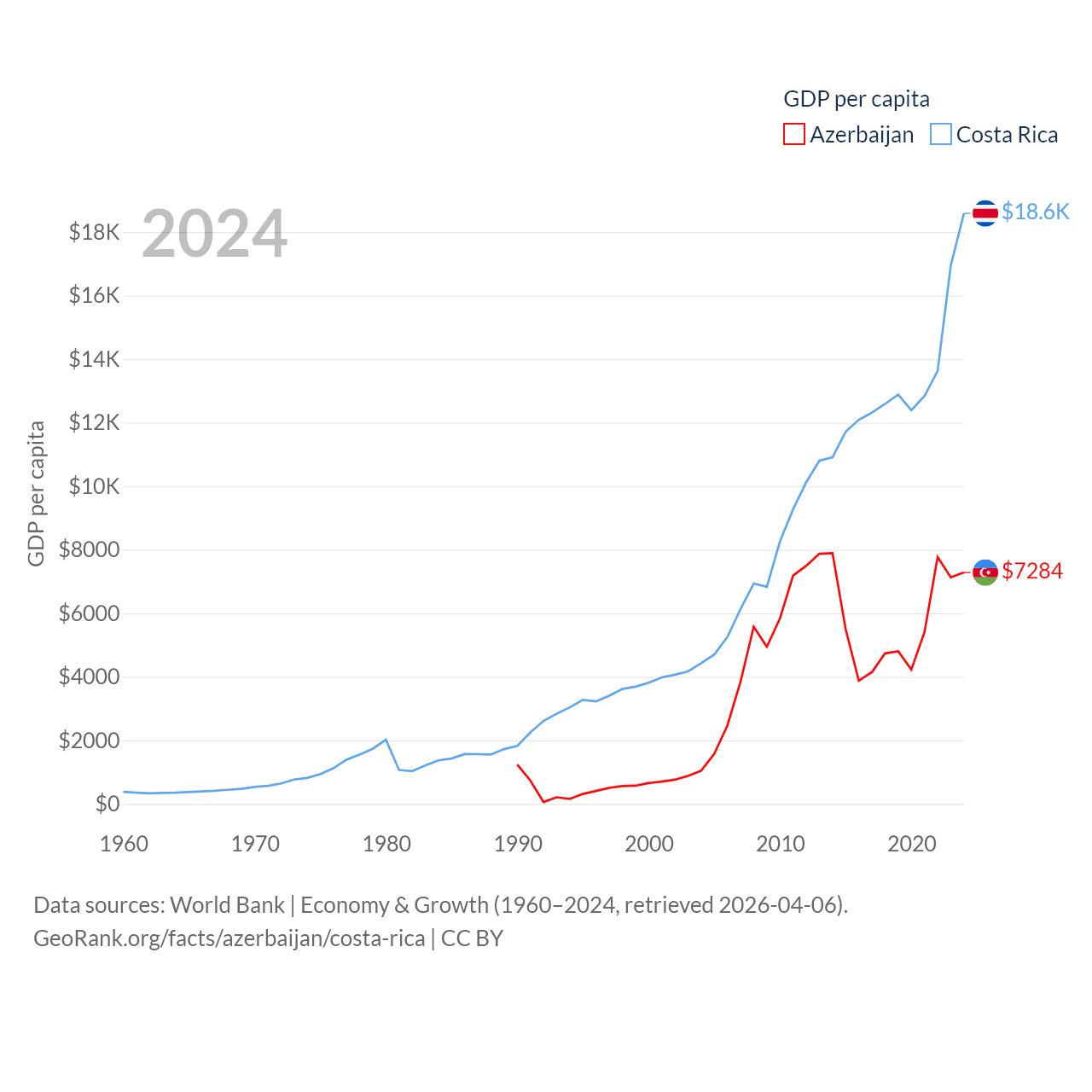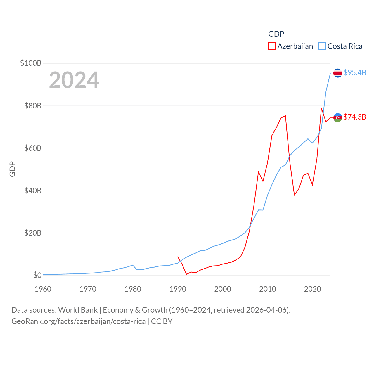 By GDP, Azerbaijan ranks 84/197 ($74.3B) and Costa Rica ranks 73/197 ($95.4B). By GDP per capita, Azerbaijan ranks 101/197 ($7,284), while Costa Rica ranks 62/197 ($18,587).