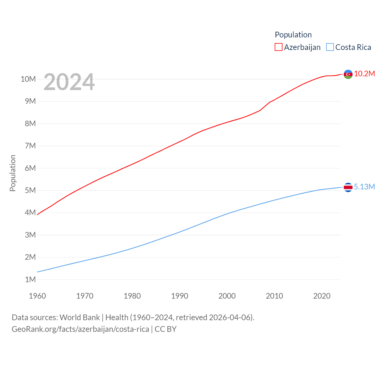 Azerbaijan has a population of 10.2M (ranked 95/197), compared with 5.13M in Costa Rica (ranked 126/197). Azerbaijan's land area is 31,911 sq mi versus 19,714 sq mi for Costa Rica (ranked 112th vs. 126th).