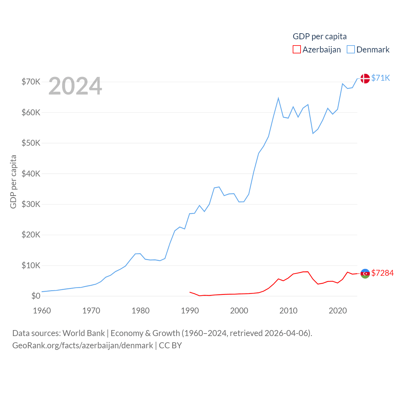 By GDP, Azerbaijan ranks 84/197 ($74.3B) and Denmark ranks 37/197 ($425B). By GDP per capita, Azerbaijan ranks 101/197 ($7,284), while Denmark ranks 12/197 ($71,026).