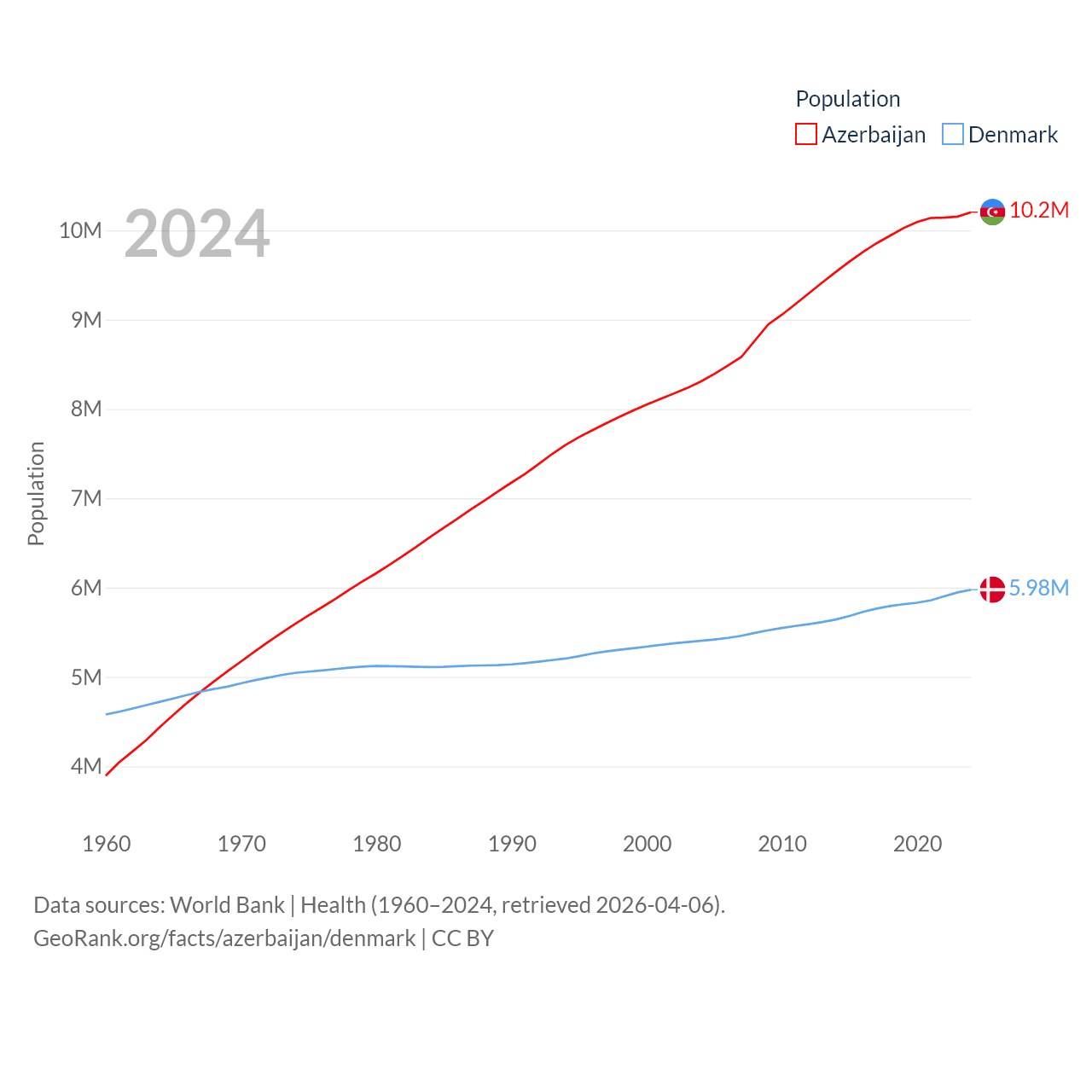 Azerbaijan has a population of 10.2M (ranked 95/197), compared with 5.98M in Denmark (ranked 114/197). Azerbaijan's land area is 31,911 sq mi versus 15,444 sq mi for Denmark (ranked 112th vs. 130th).