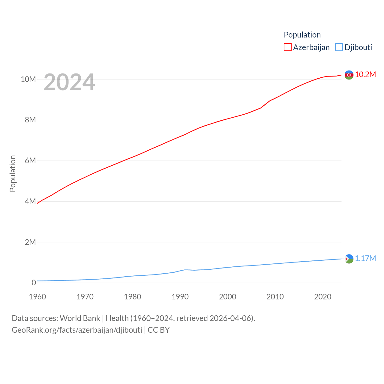 Azerbaijan has a population of 10.2M (ranked 95/197), compared with 1.17M in Djibouti (ranked 158/197). Azerbaijan's land area is 31,911 sq mi versus 8,950 sq mi for Djibouti (ranked 112th vs. 147th).