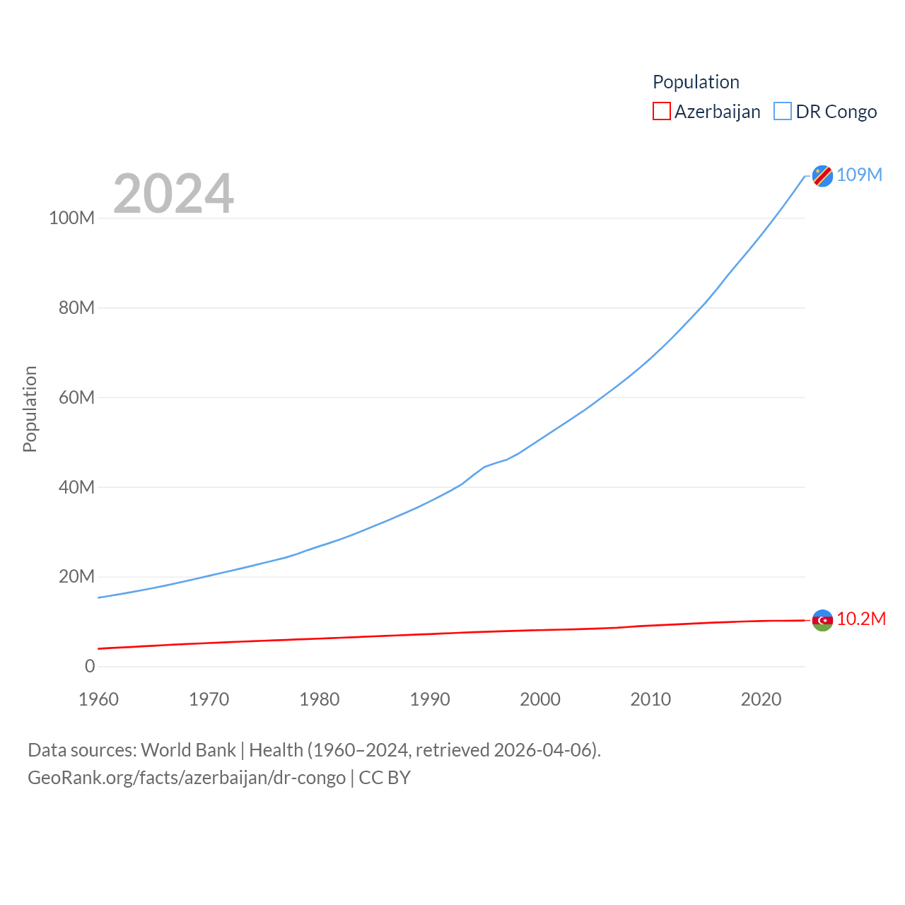 Azerbaijan has a population of 10.2M (ranked 95/197), compared with 109M in The DR Congo (ranked 15/197). Azerbaijan's land area is 31,911 sq mi versus 875,313 sq mi for The DR Congo (ranked 112th vs. 11th).