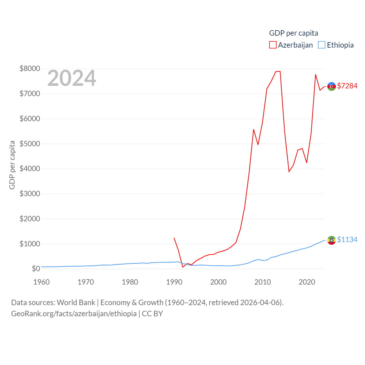 By GDP, Azerbaijan ranks 84/197 ($74.3B) and Ethiopia ranks 60/197 ($150B). By GDP per capita, Azerbaijan ranks 101/197 ($7,284), while Ethiopia ranks 171/197 ($1,134).