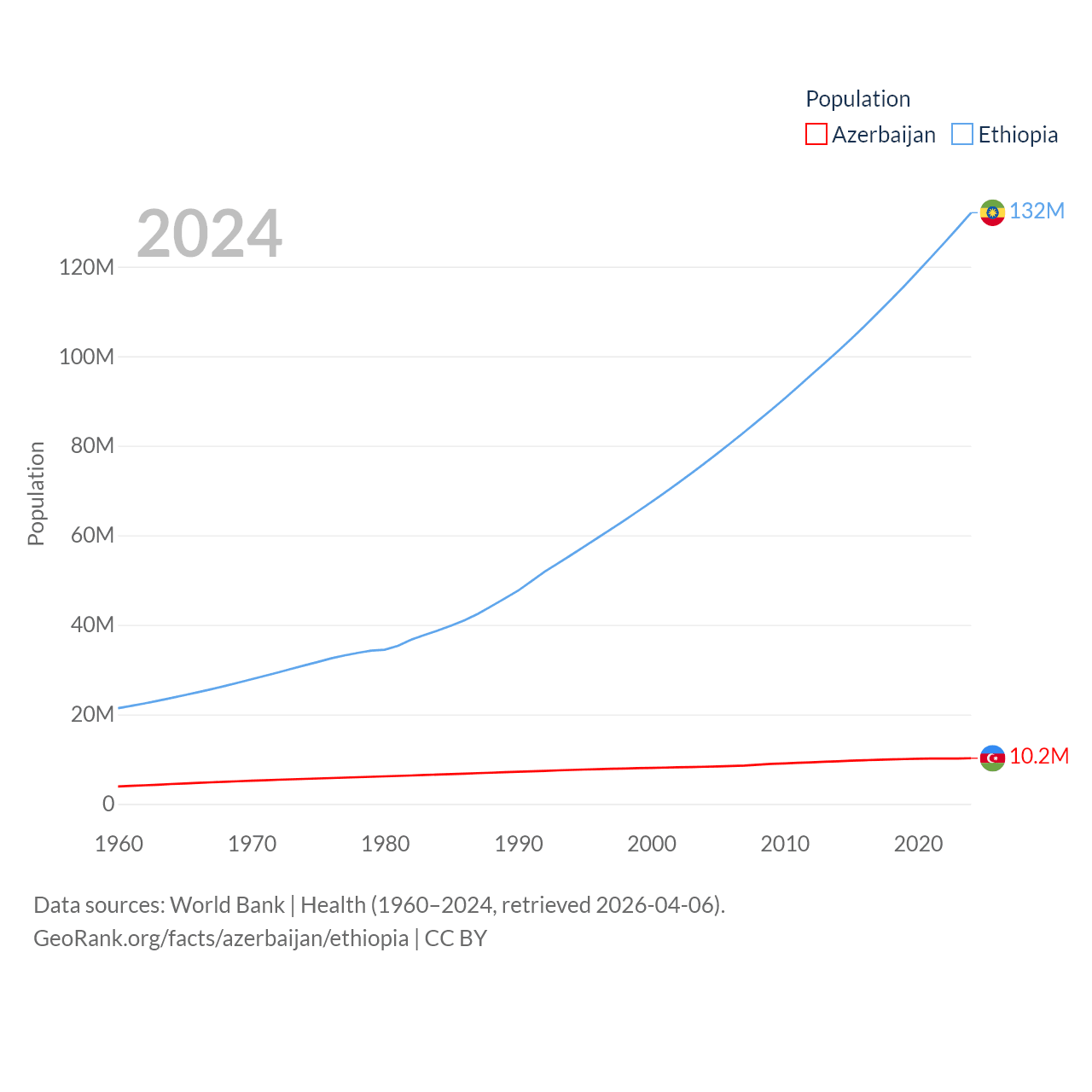 Azerbaijan has a population of 10.2M (ranked 95/197), compared with 132M in Ethiopia (ranked 10/197). Azerbaijan's land area is 31,911 sq mi versus 435,716 sq mi for Ethiopia (ranked 112th vs. 25th).