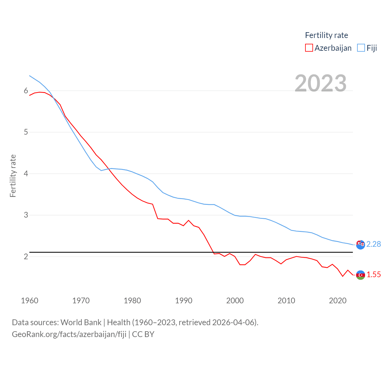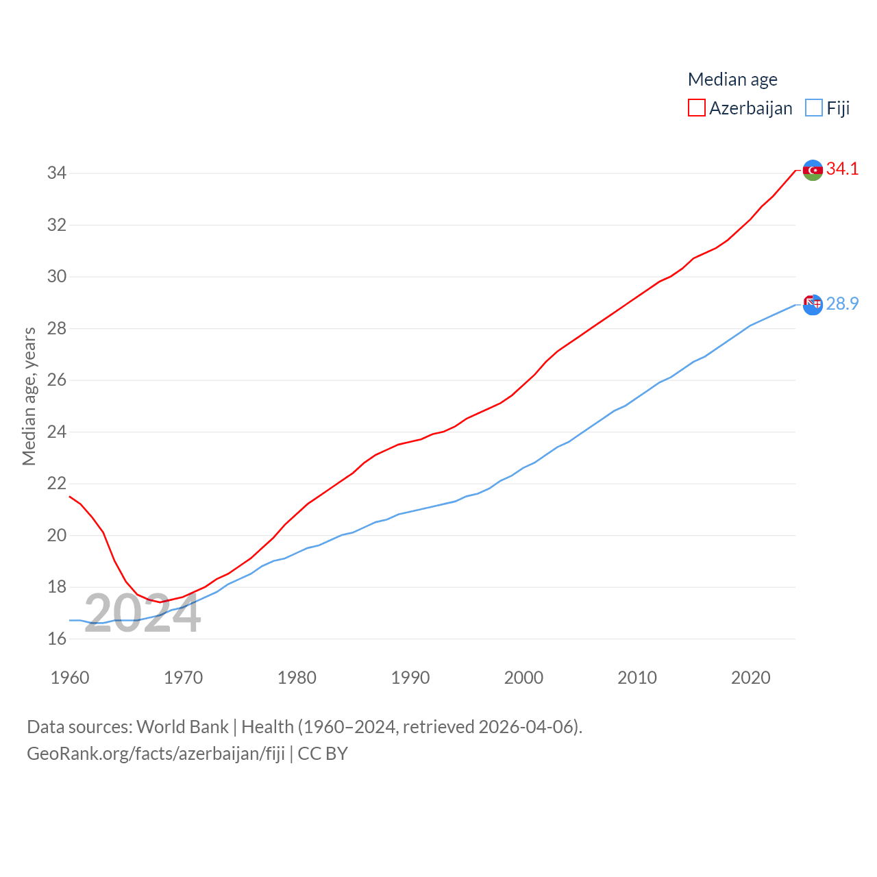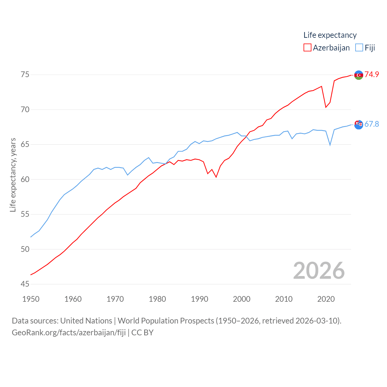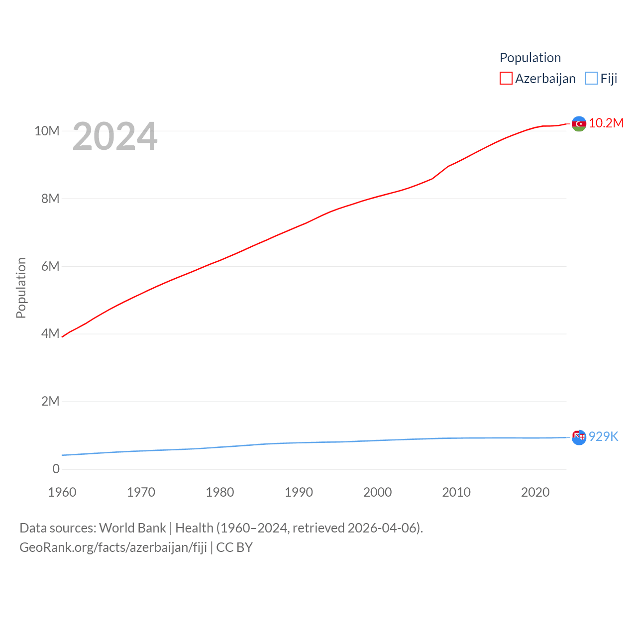 Azerbaijan has a population of 10.2M (ranked 95/197), compared with 929K in Fiji (ranked 159/197). Azerbaijan's land area is 31,911 sq mi versus 7,054 sq mi for Fiji (ranked 112th vs. 152nd).