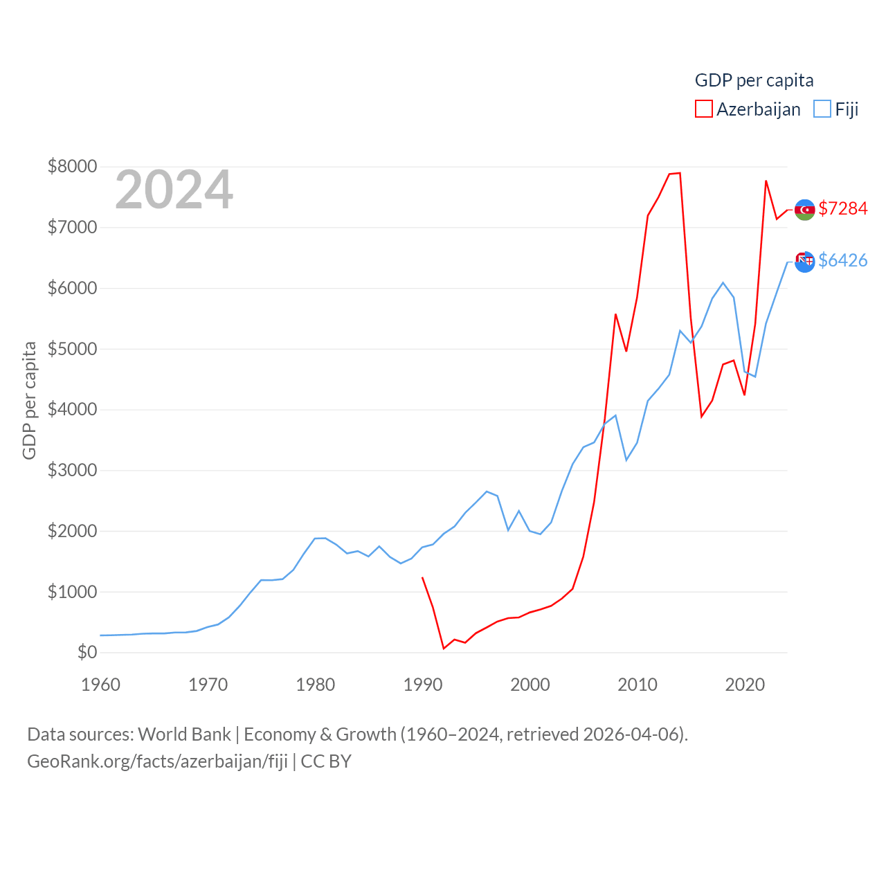 By GDP, Azerbaijan ranks 84/197 ($74.3B) and Fiji ranks 161/197 ($5.97B). By GDP per capita, Azerbaijan ranks 101/197 ($7,284), while Fiji ranks 108/197 ($6,426).