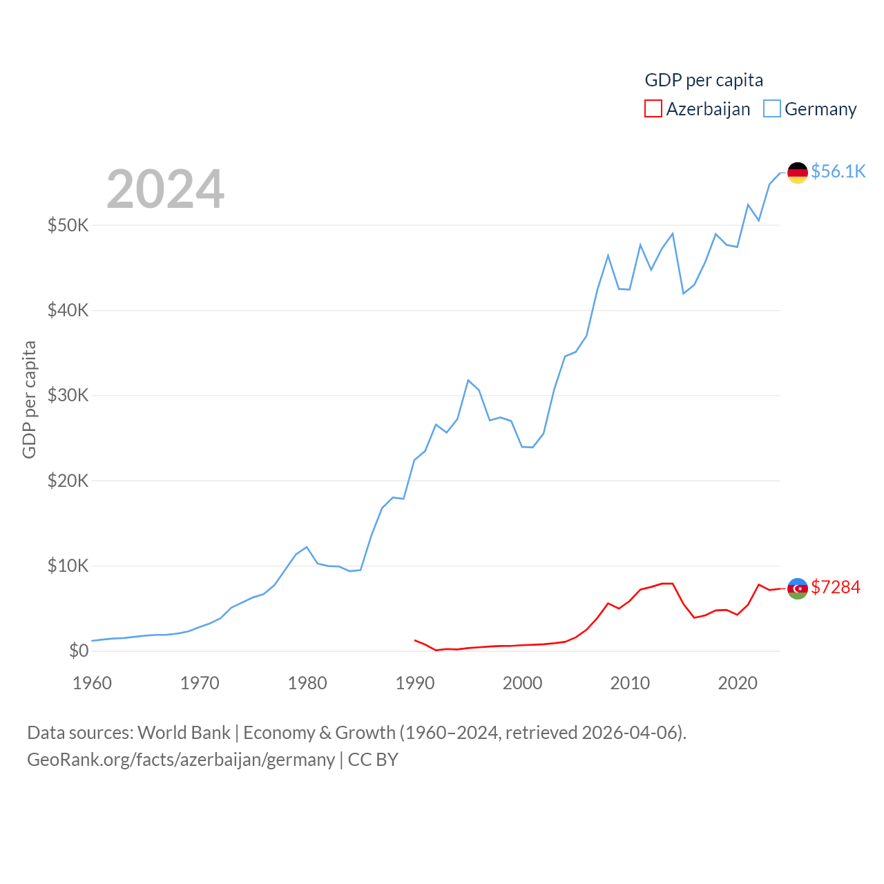 By GDP, Azerbaijan ranks 84/197 ($74.3B) and Germany ranks 3/197 ($4.69T). By GDP per capita, Azerbaijan ranks 101/197 ($7,284), while Germany ranks 19/197 ($56,104).