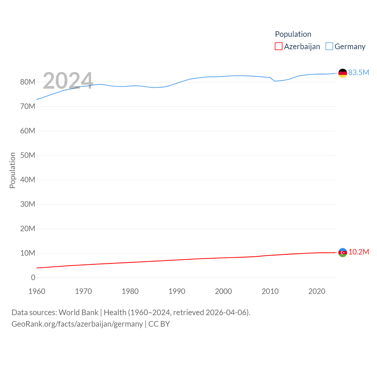 Azerbaijan has a population of 10.2M (ranked 95/197), compared with 83.5M in Germany (ranked 19/197). Azerbaijan's land area is 31,911 sq mi versus 134,916 sq mi for Germany (ranked 112th vs. 63rd).