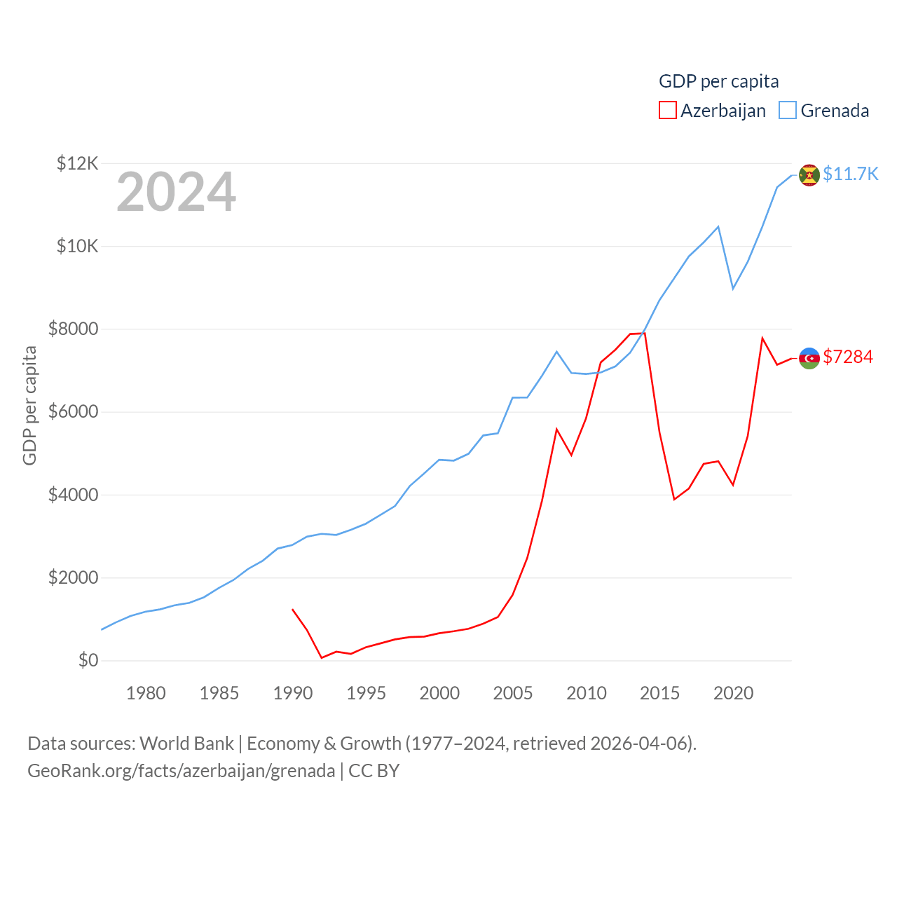 By GDP, Azerbaijan ranks 84/197 ($74.3B) and Grenada ranks 184/197 ($1.37B). By GDP per capita, Azerbaijan ranks 101/197 ($7,284), while Grenada ranks 80/197 ($11,705).