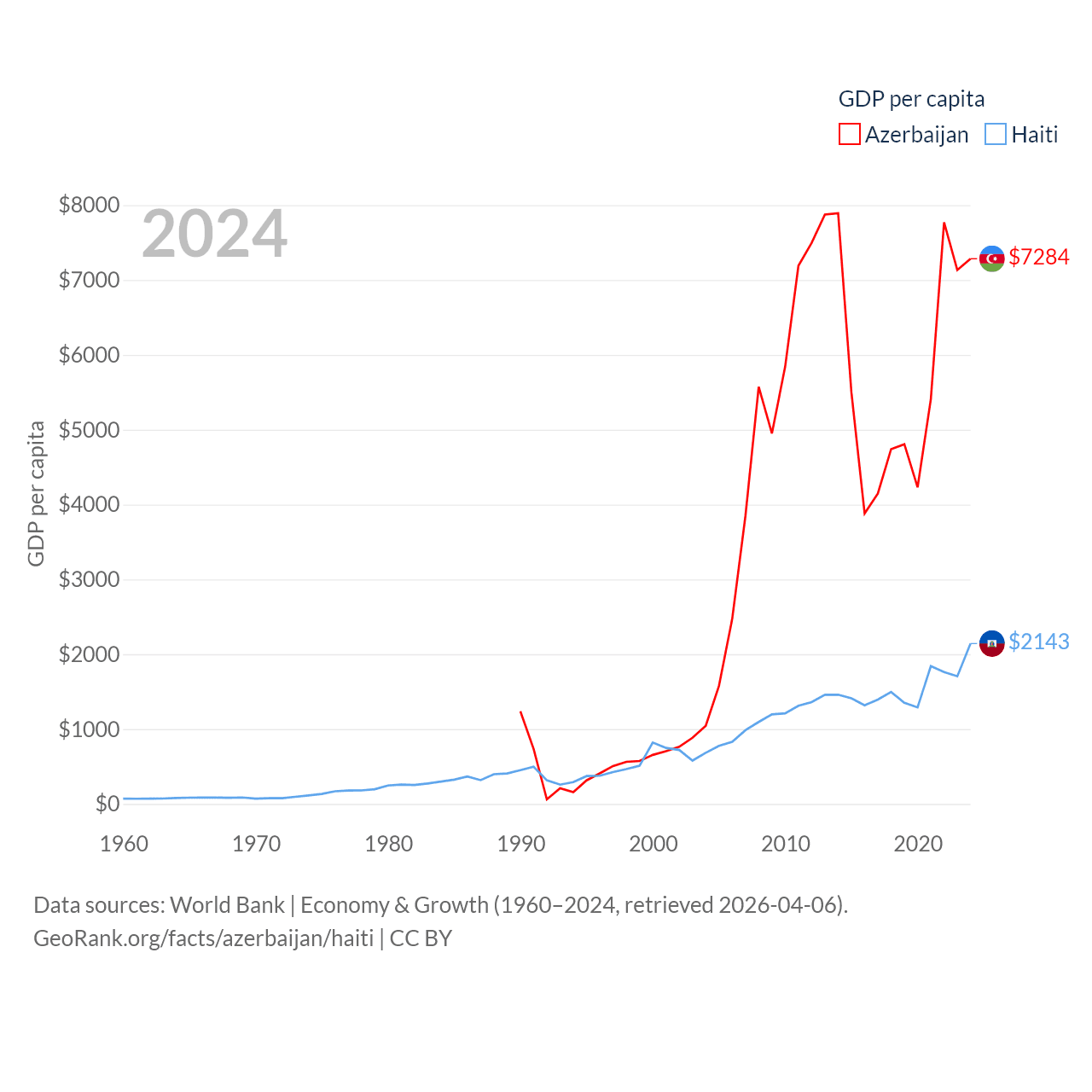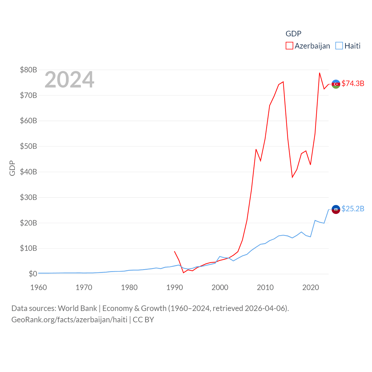 By GDP, Azerbaijan ranks 84/197 ($74.3B) and Haiti ranks 117/197 ($25.2B). By GDP per capita, Azerbaijan ranks 101/197 ($7,284), while Haiti ranks 153/197 ($2,143).